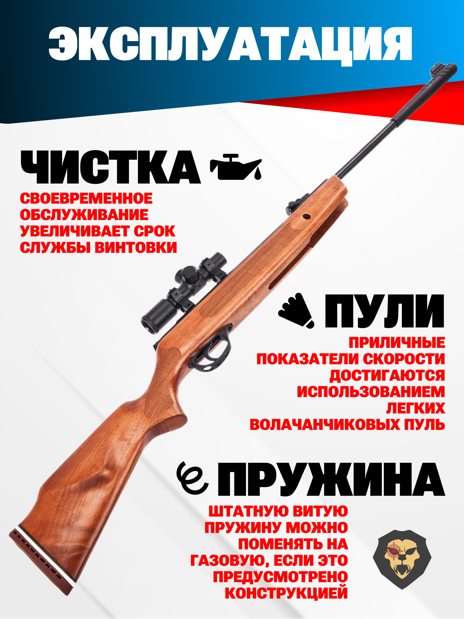 Внимание! Данная модель поставляется в разрешенной мощности для свободного приобретения на территории Российской Федерации. При этом в модели имеется возможность увеличения мощности путем замены части деталей или настройки конструкции, однако не стоит забывать о Федеральном законе «Об оружии» № 150 - ФЗ. В случае необходимости, опираясь на данный закон и руководствуясь им, возможно, потребуется получить разрешение от ЛЛР ГУ МВД России после вмешательства в конструкцию.