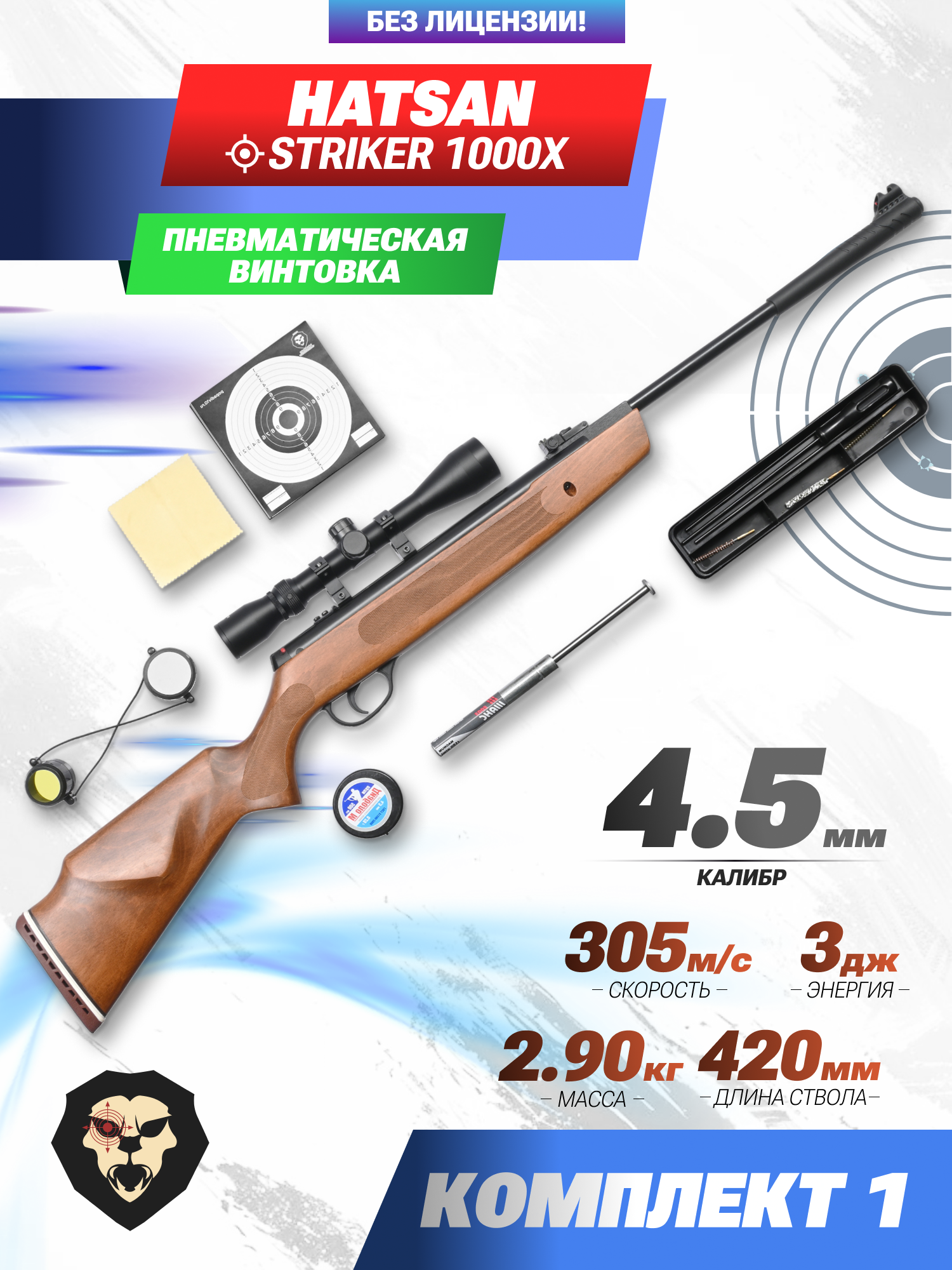 Пневматическая винтовка Hatsan Striker 1000X 4.5 мм комплект Hunter №1 (прицел, кольца, газовая пружина, мишени, пули, набор для чистки, 3 Дж, дерево) купить в интернет-магазине Popadiv10.