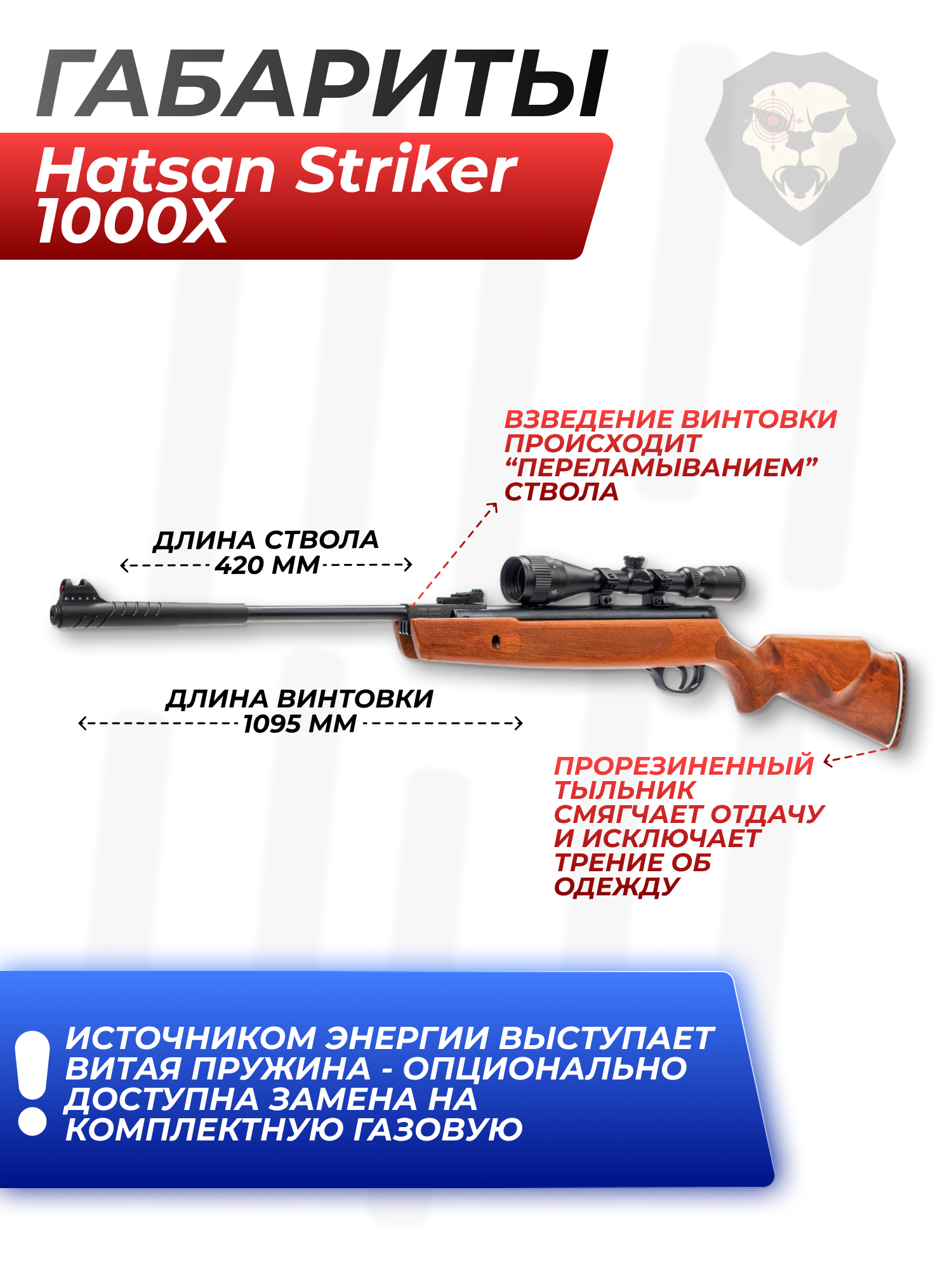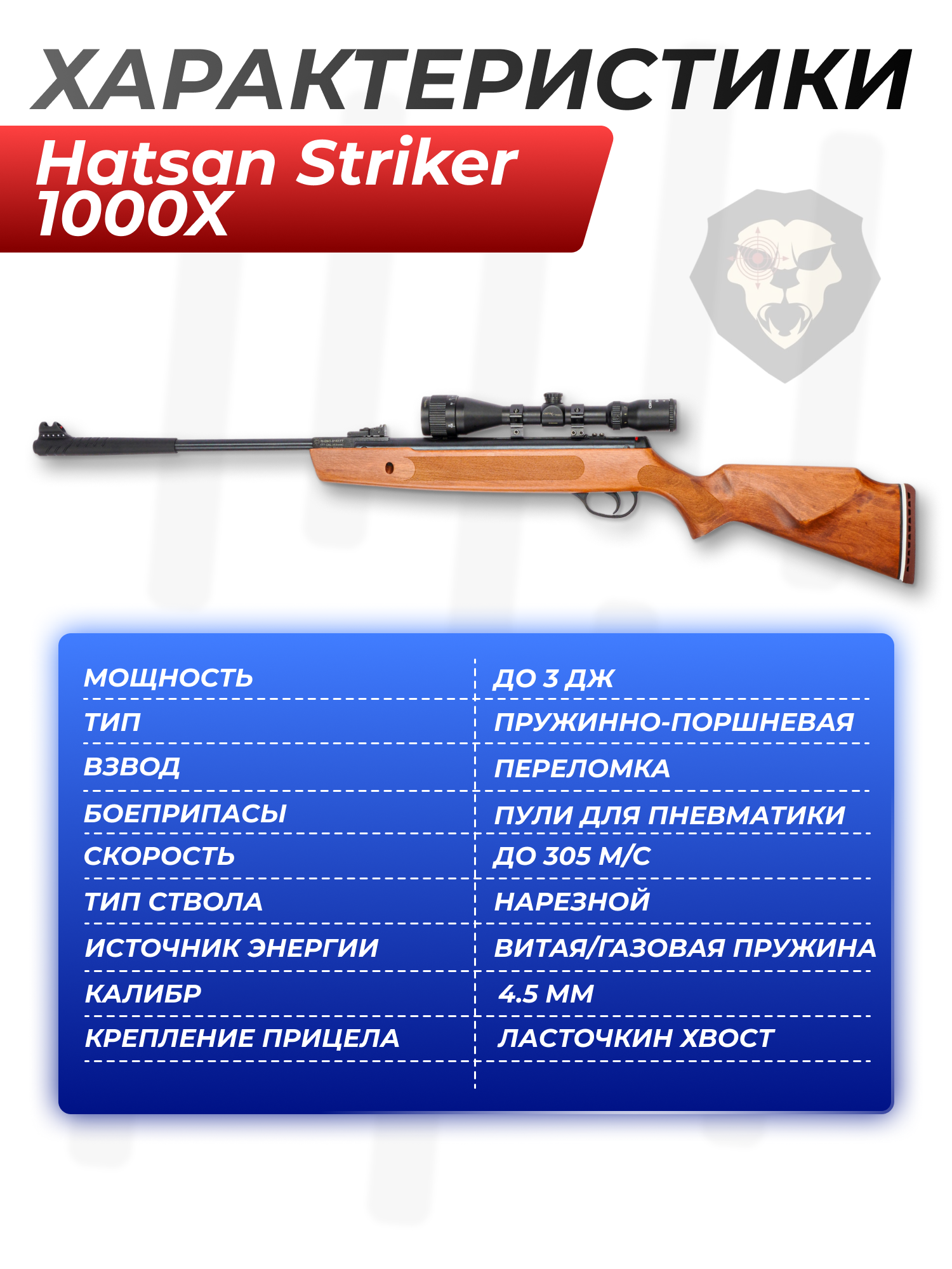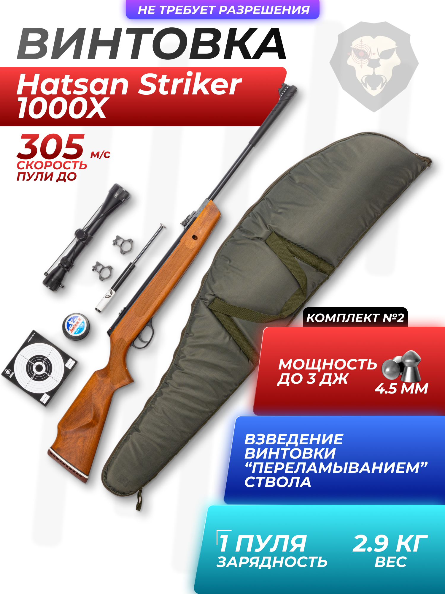 Информация о товаре "Пневматическая винтовка Hatsan Striker 1000X комплект Hunter №2 (прицел, кольца, газовая пружина, чехол, мишени, пули, набор для чистки, 3 Дж, 4.5 мм, дерево)" носит ознакомительный характер, и не является публичной офертой, определяемой положениями Статьи 437 Гражданского кодекса Российской Федерации, характеристики, внешний вид, цвет и комплектация могут быть изменены производителем без уведомления.
