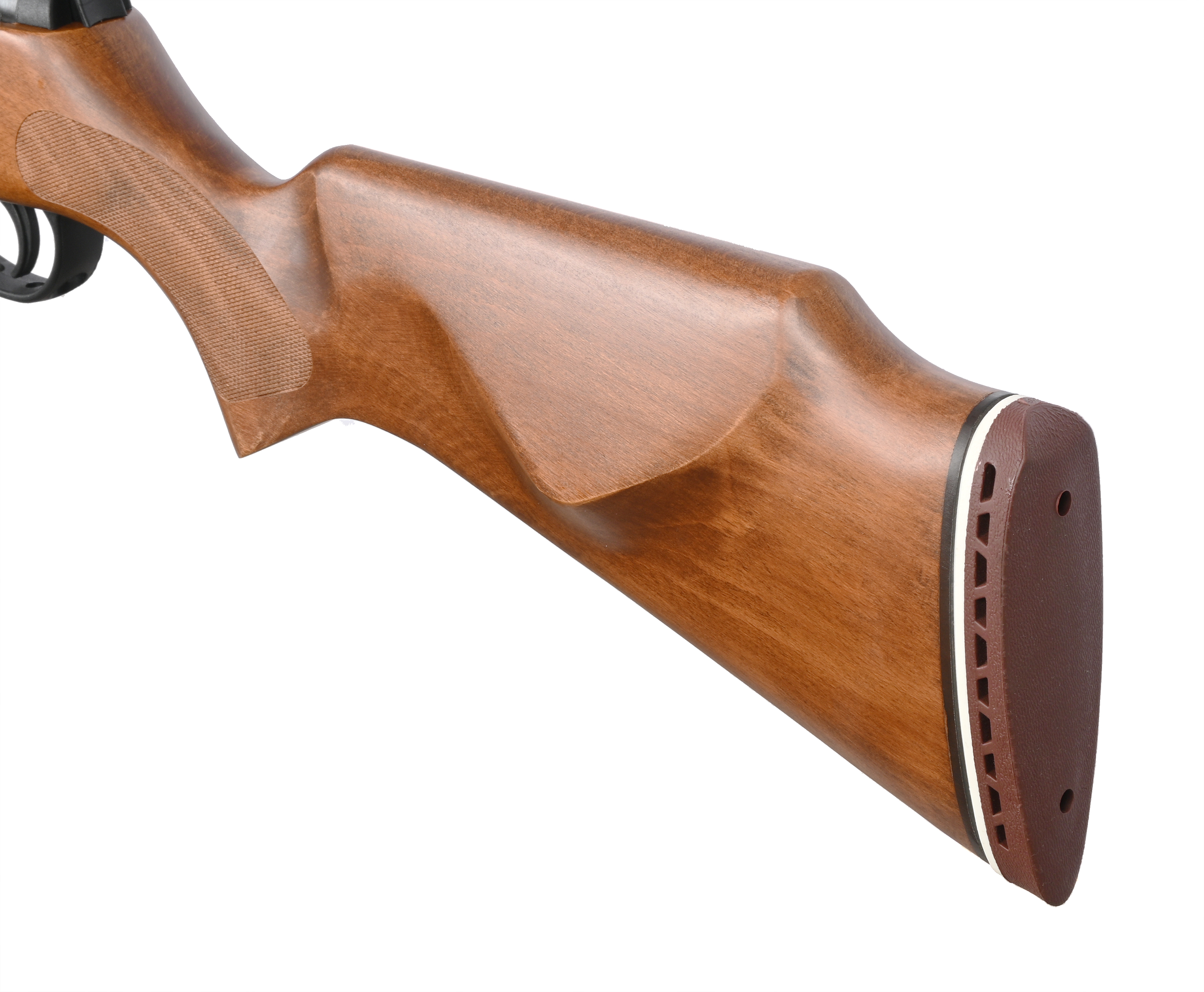 Хантер №2 собрали на базе пневматики Hatsan mod 1000X - винтовки из серии Striker, отличающейся от прочих моделей ложей из дерева. Использование традиционного материала ощутимо повышает привлекательность винтовки - на древесине проявляется текстура, а лак на поверхности подчеркивает ее глубину. Кроме прочего, фурнитура делает стрельбу комфортной - в зонах соприкосновения нарезали противоскользящий узор, а отдача становится мягче благодаря резиновому упору.