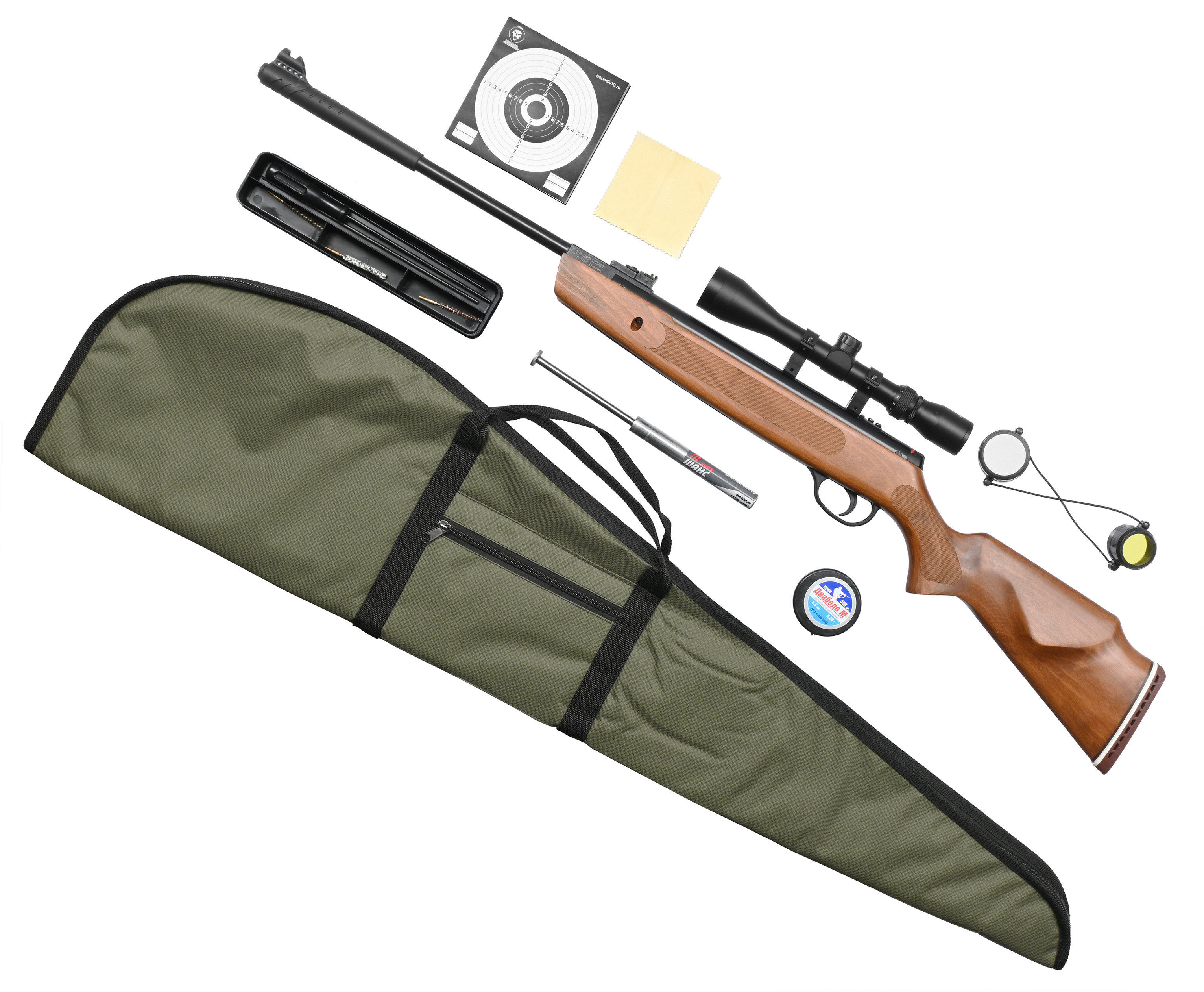 Комплектация | Винтовка, прицел, кольца, газовая пружина, чехол, мишени, пули, набор для чистки, упаковка, краткая документация, копия сертификата (по запросу покупателя) |