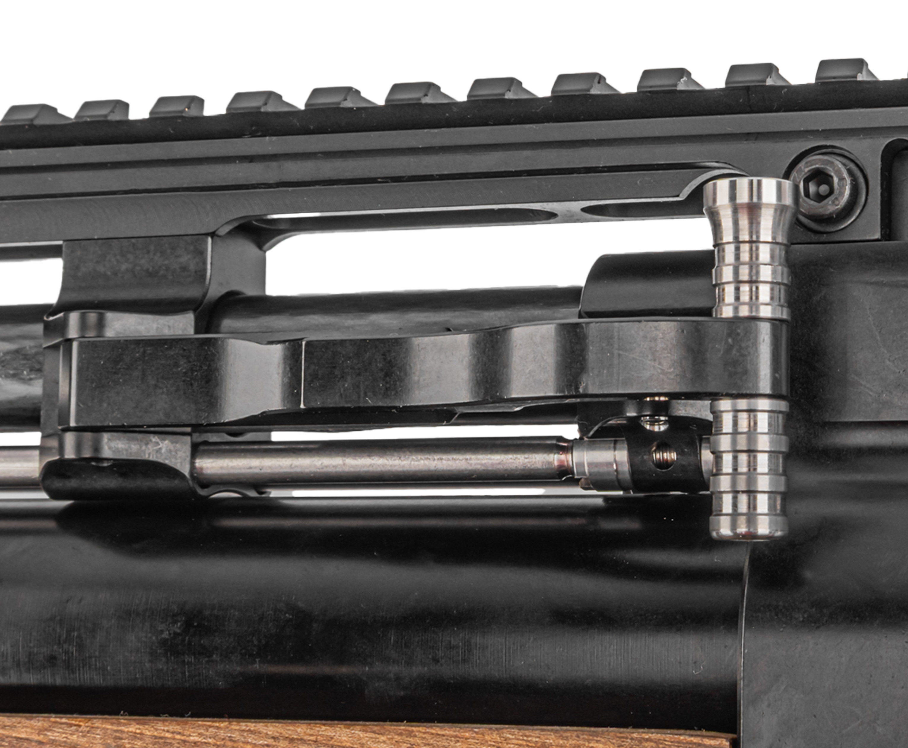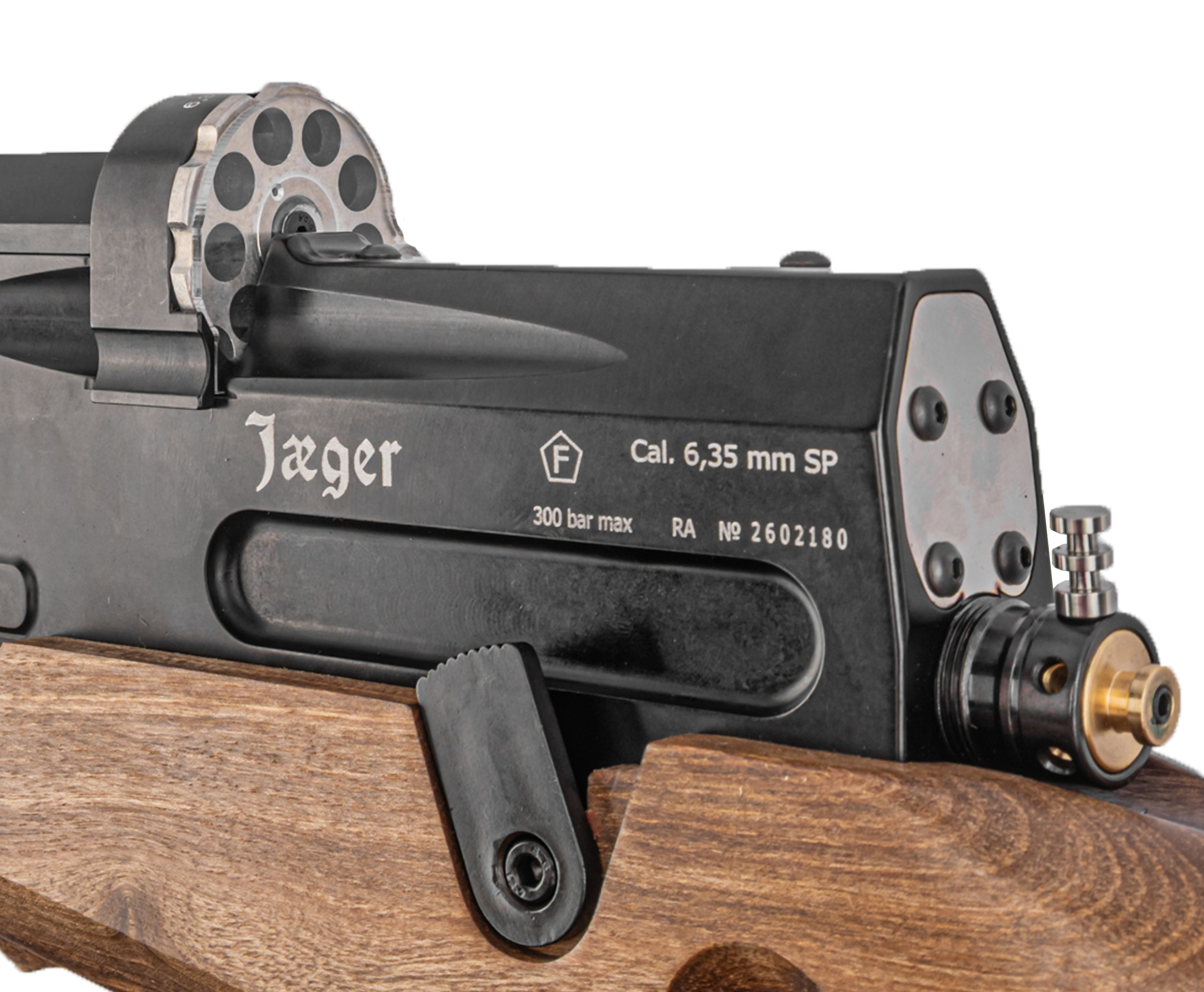 Винтовка Егерь 6.35 мм совершает стрельбу в одиночном режиме после отведения рычага затвора. Указанный узел перенесен с приклада в переднюю часть оружия, что дает сохранить вкладку при манипуляциях. Чтобы предотвратить случайный спуск, пневматика по мере необходимости выставляется на предохранитель.