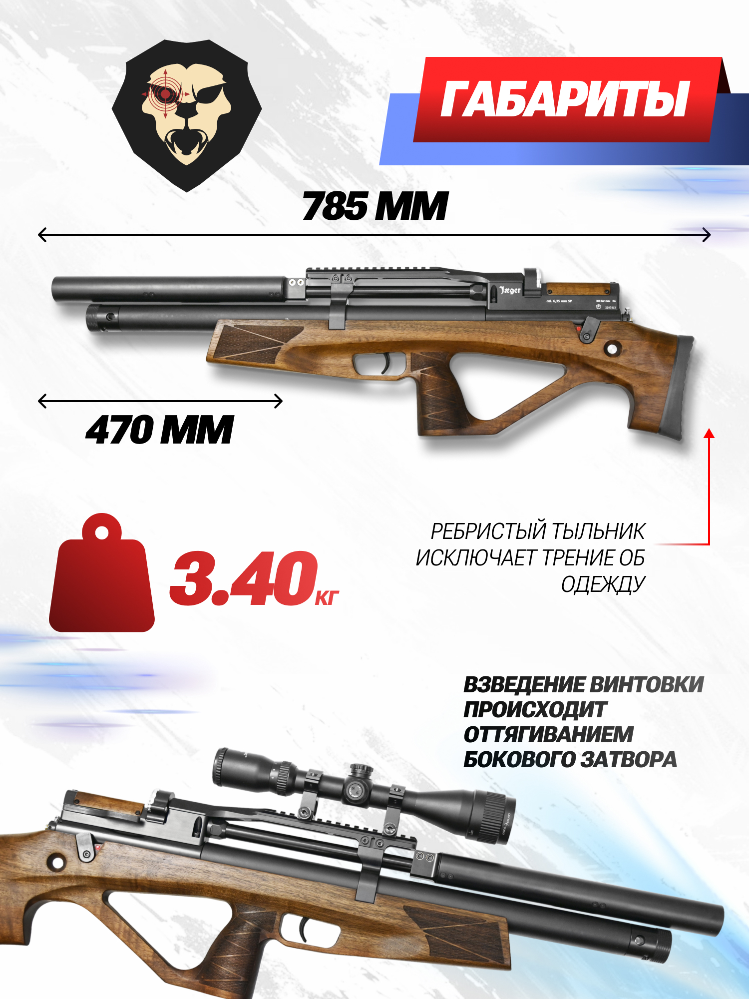 Рассматриваемый вид пневматического оружия от Jager изготавливается в компоновке Булл Пап, что значительно сокращает размеры оружия за счет переноса пистолетной рукояти и основных органов управления в переднюю часть. Такой вариант компоновки позволяет сократить длину винтовки до 785 миллиметров при длине ствола 470. Это делает винтовку комфортной для применения в условиях ограниченного пространства.