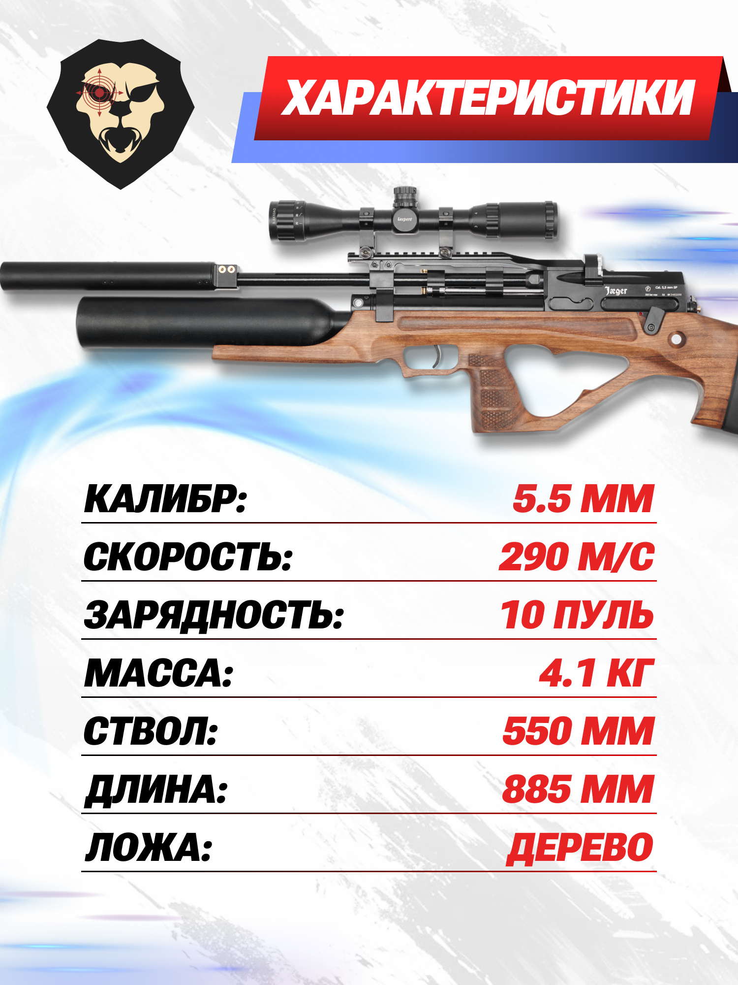 Пневматика Егерь обладает эргономичным ложем, выполненным из дерева повышенной прочности. Что касается bull-pup компоновки, то благодаря ей изготовителям удалось уменьшить габарит платформы, из-за чего на порядок возрос уровень удобства транспортировки и непосредственной эксплуатации оружия.