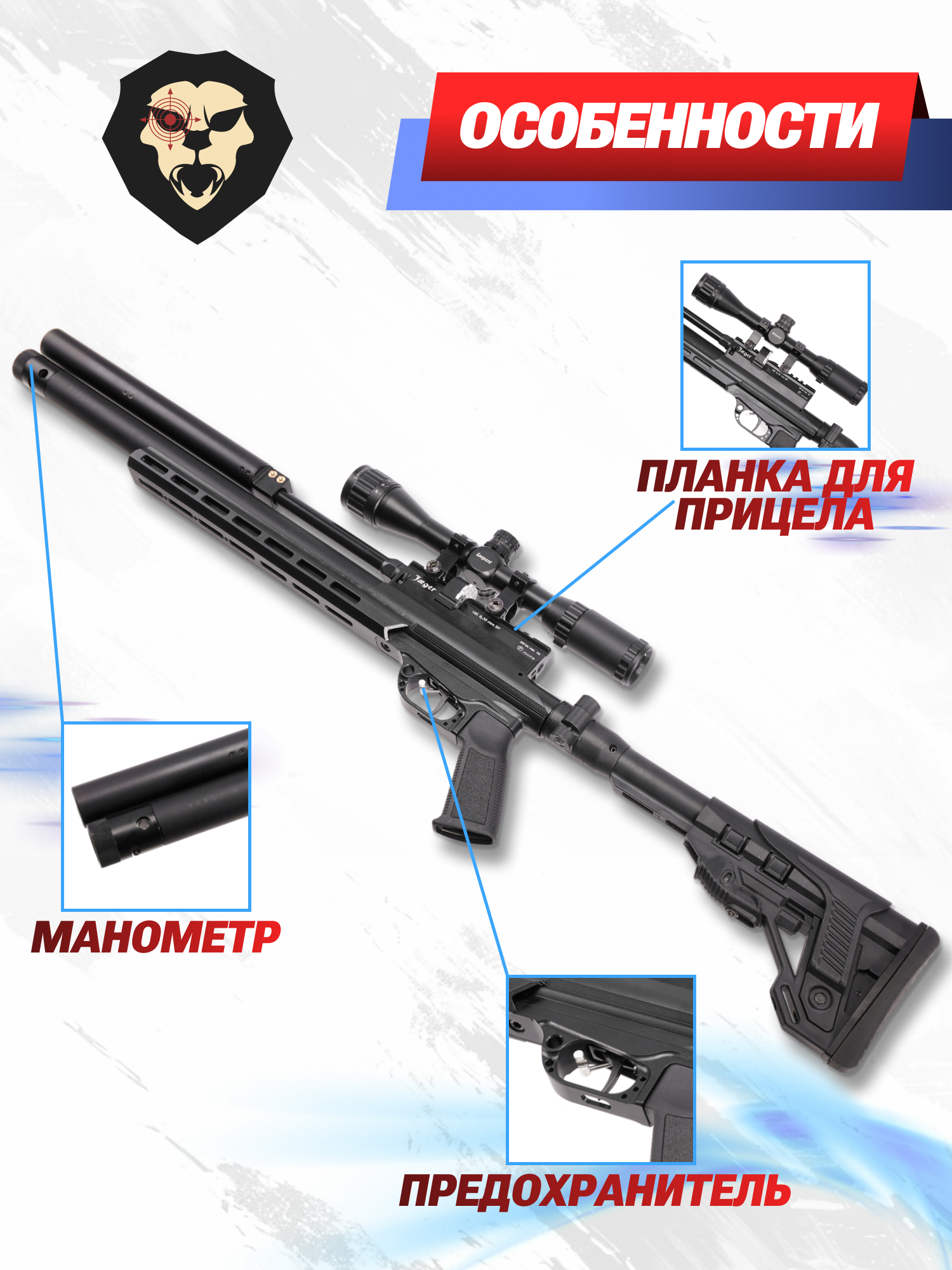 Чтобы избежать случайного нажатия на триггер, в конструкции предусмотрен предохранитель - переключатель расположен внутри спусковой скобы рядом с крючком. В верхней части коробки пневматики присутствует направляющая современного стандарта Weaver 22 мм. Планка располагает к установке совместимых оптических прицелов на кольцах.