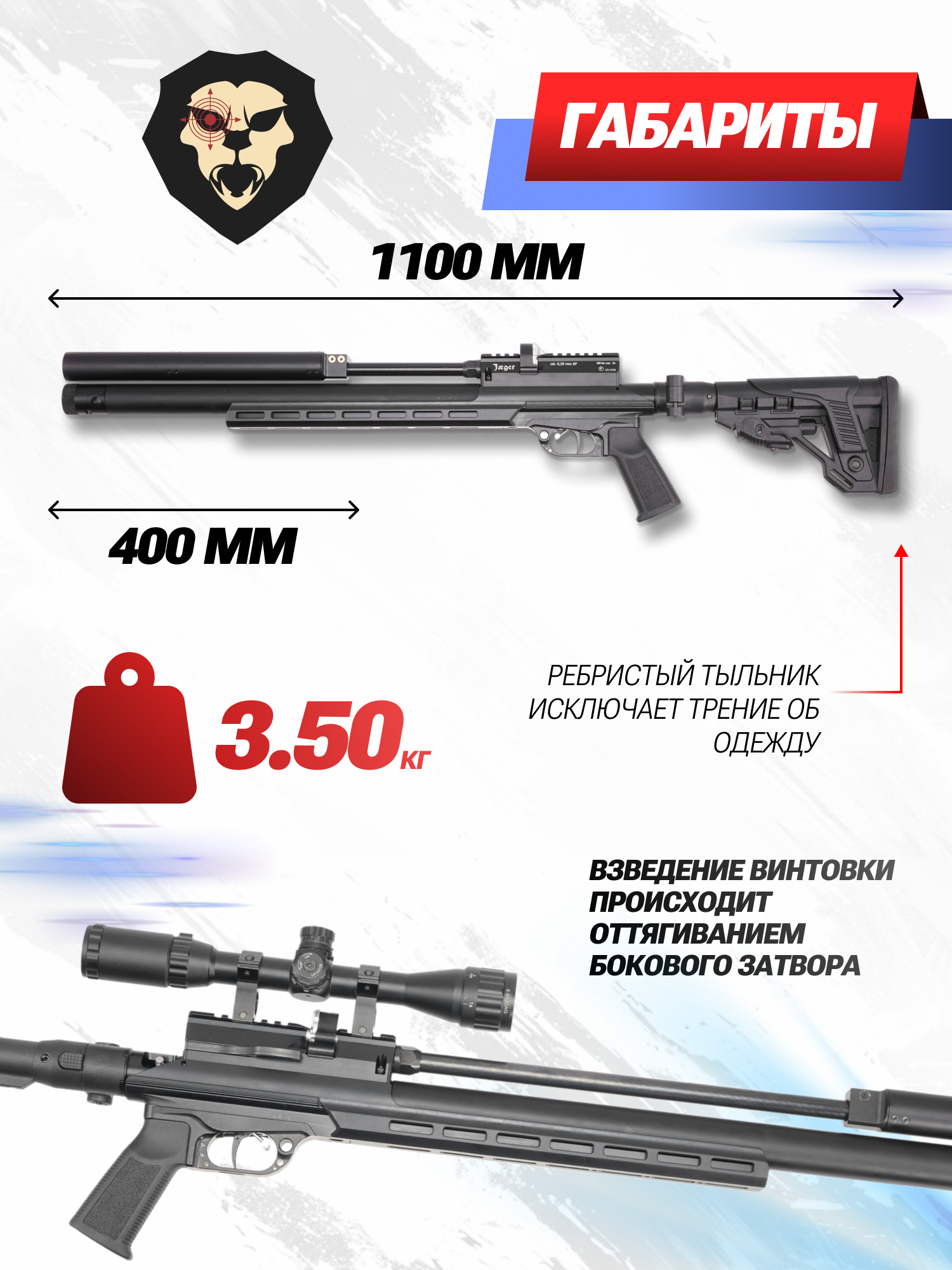 Ложа карабина выполнена из металла со специальным покрытием, защищающим поверхность от образования коррозии. Удобству удержания способствует пластиковая эргономичная рукоять. Пневматика Jager также оснащается складным телескопическим прикладом - помимо регулировки длины, плечевой упор имеет настраиваемую по высоте щеку.