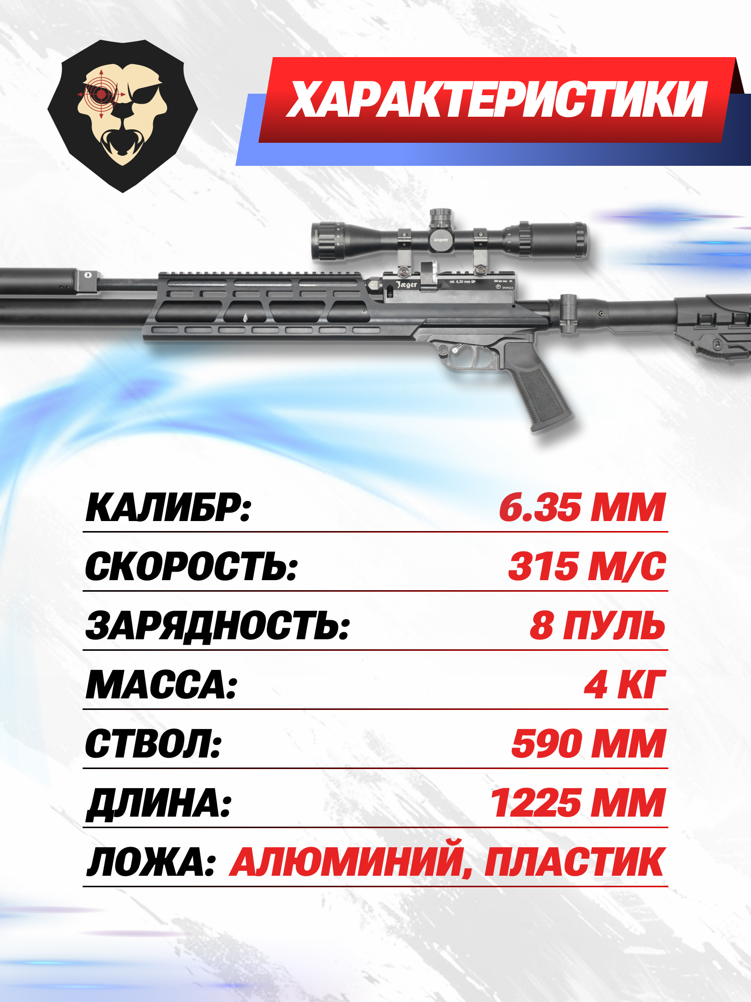 Изготовитель характеризует обозреваемую модель пневматики как мощную ПЦП винтовку, дульной энергии которой достаточно для разгона снарядов до скорости, превышающей 315 метров в секунду. При этом, необходимо отметить, что свободная реализация винтовки Jager SP 6.35 карабин 590 мм на российском оружейном рынке обеспечена намеренным ограничением показателя мощности на отметке в три Джоуля, обусловленной требованиями федерального законодательства.
