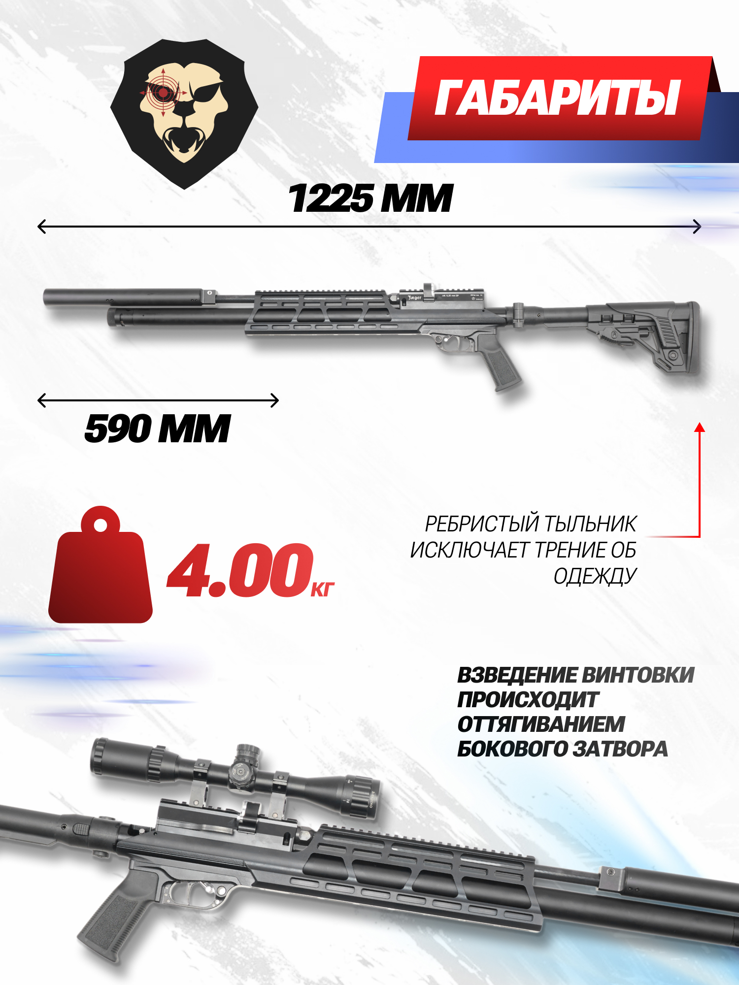 | Комплектация | Винтовка, магазин - 1 шт, упаковка, заправочный штуцер, краткая документация, копия сертификата (по запросу покупателя) |