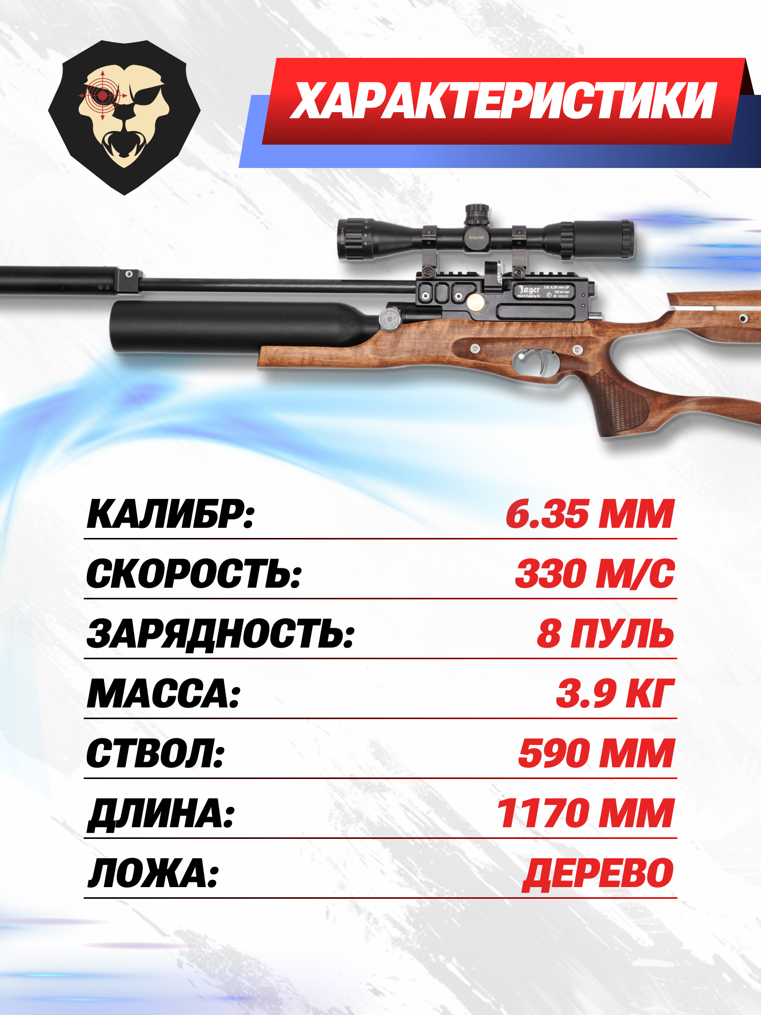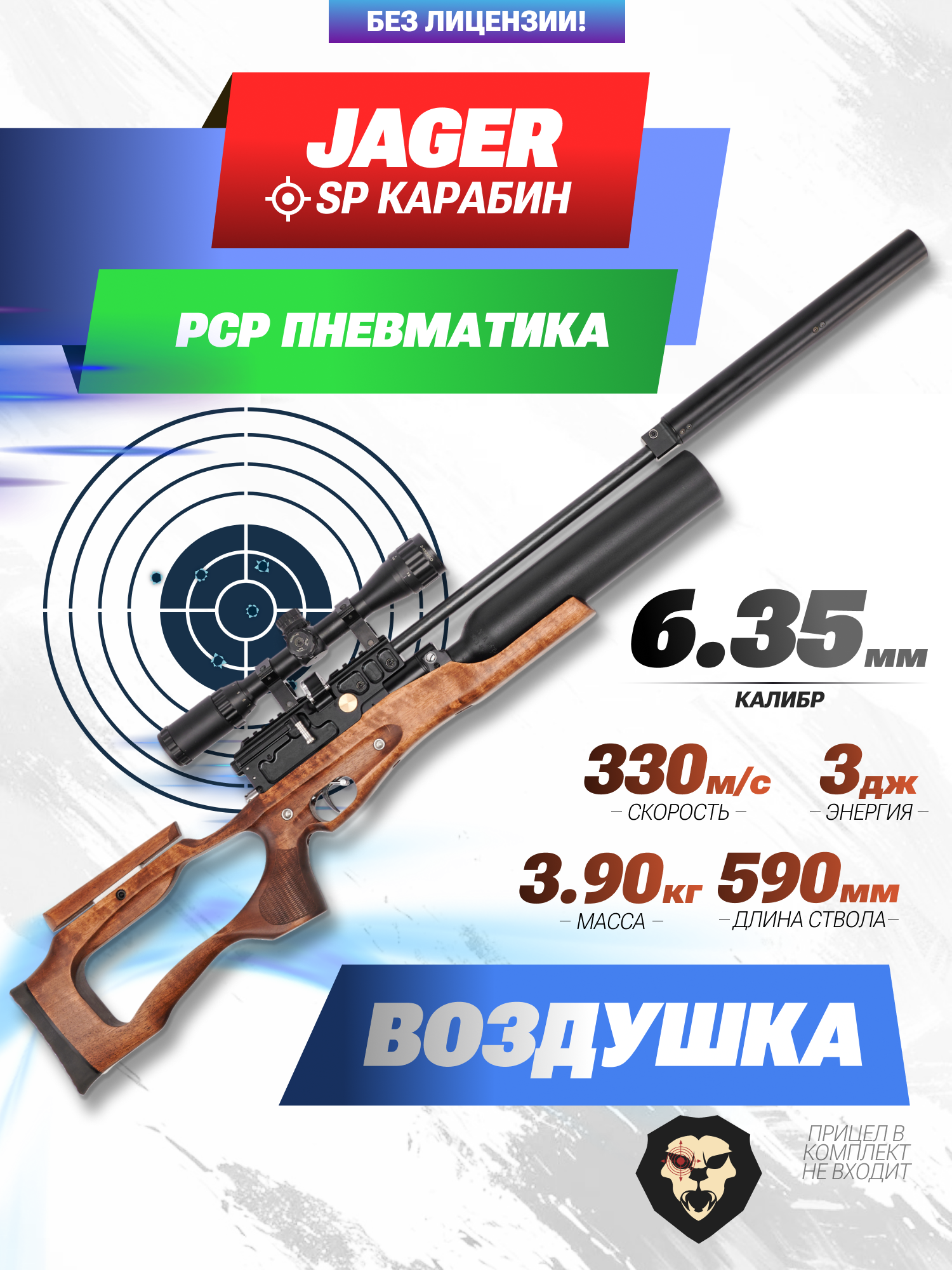 Согласно заявленным характеристикам экспортные винтовки метают заряд со скоростью 330 м/с. Jager SP карабин колба представленного образца предназначается для российских стрелков - поэтому ее мощность регулируется до значения в 3 Дж. В свою очередь это дает приобрести пневматику без лицензии любому желающему, который достиг возраста совершеннолетия.