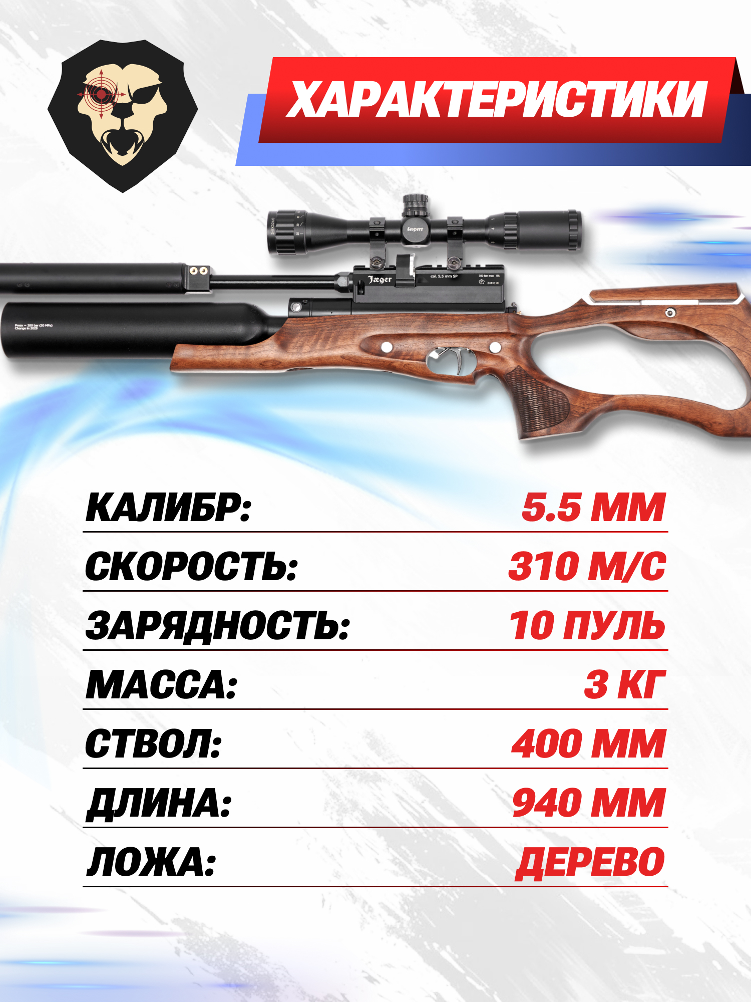 Ложе винтовки Jager изготовили из дерева. Для комфорта обращения производитель добавил выдвижной подщечник и насечку на рукояти. Габарит изделия в этом исполнении равен 94 сантиметрам.