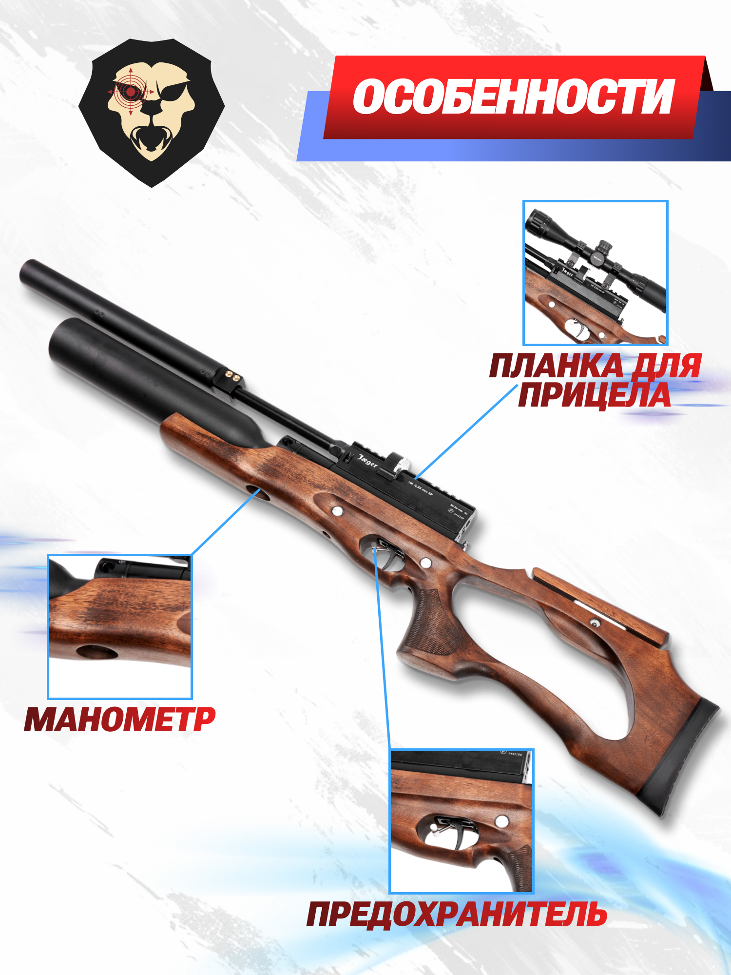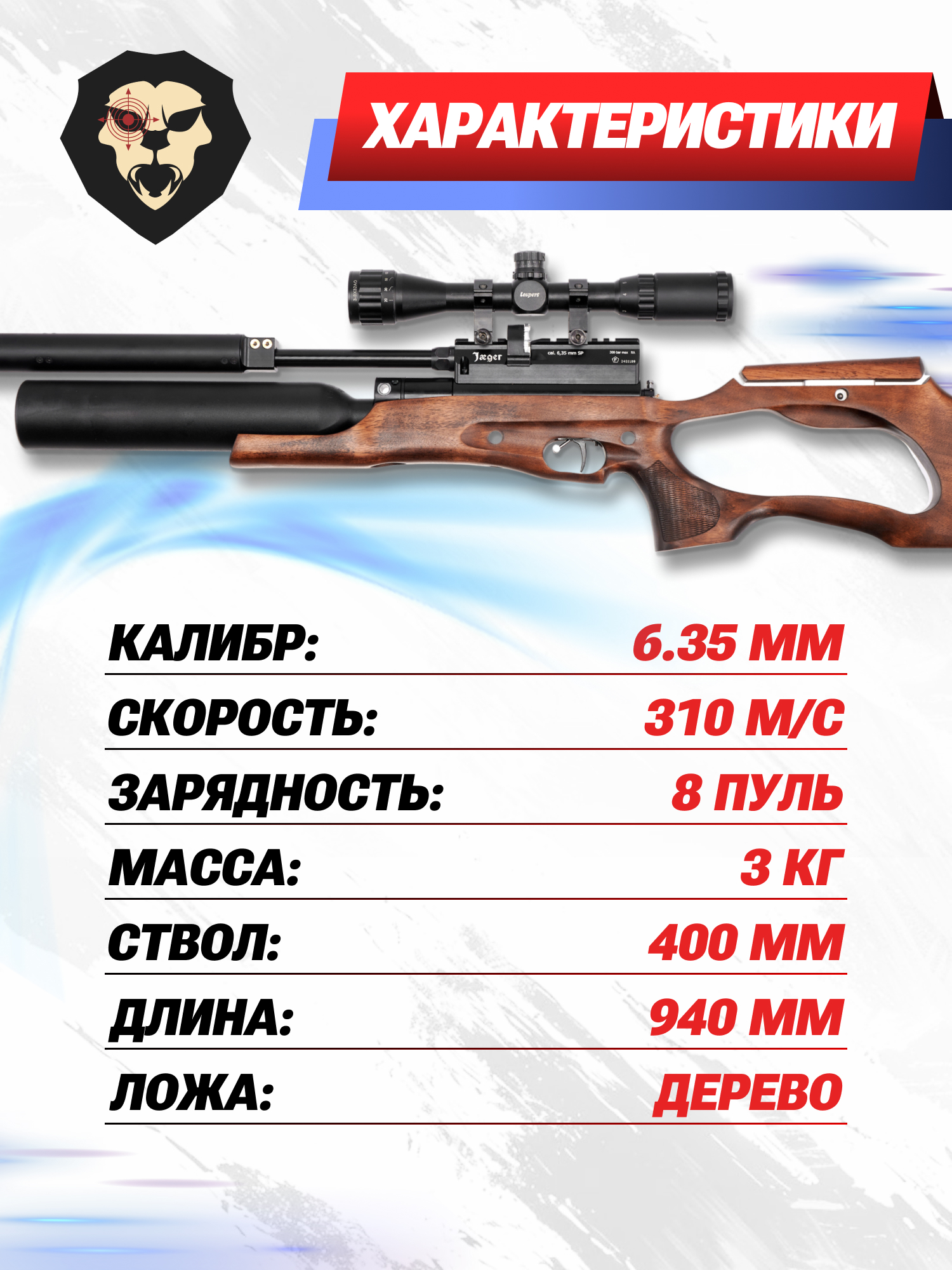 Информация о товаре "Пневматическая винтовка Jager SP Карабин 6.35 мм (колба, 400 мм, AP)" носит ознакомительный характер, и не является публичной офертой, определяемой положениями Статьи 437 Гражданского кодекса Российской Федерации, характеристики, внешний вид, цвет и комплектация могут быть изменены производителем без уведомления.