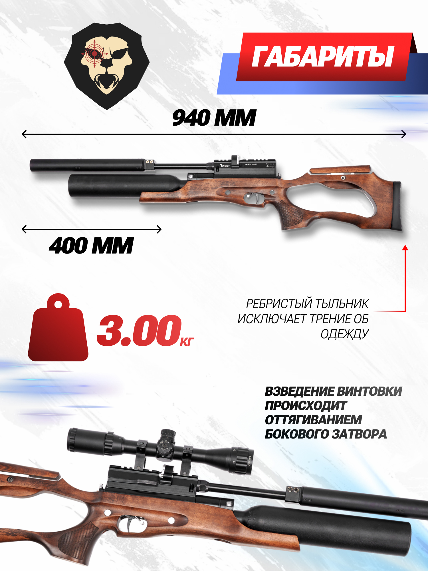 Представленная модель выполнена в формате карабина с деревянной ложей. Последняя характеризуется эргономичной формой - приклад выделяется наличием резинового тыльника и настраиваемого по высоте подщечника, что положительно сказывается на удобстве удержания и прицеливания. Габарит винтовки не превышает 94 см.