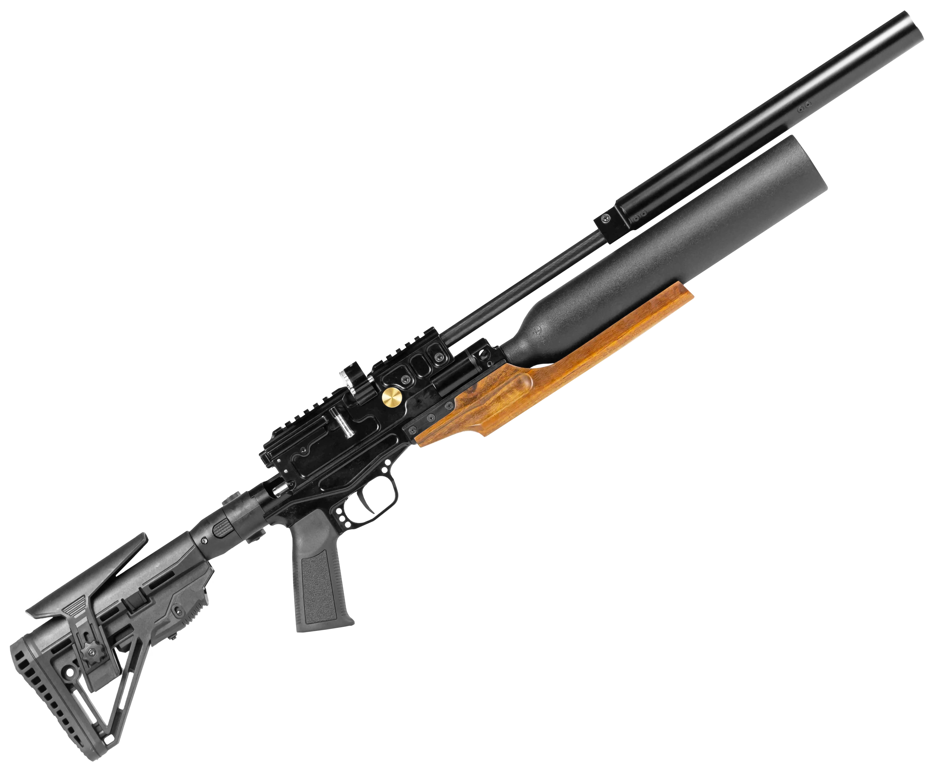Размер пневматики при этом можно дополнительно уменьшить путем складывания приклада. Для этого в его основании предусмотрен узел с кнопочным фиксатором, по нажатию на который телескопический плечевой упор AR-типа смещается вбок. Фурнитура выполнена преимущественно из ударостойкого пластика, однако цевье изготовлено из натуральной древесины, что вкупе придает изделию необычный привлекательный внешний вид.