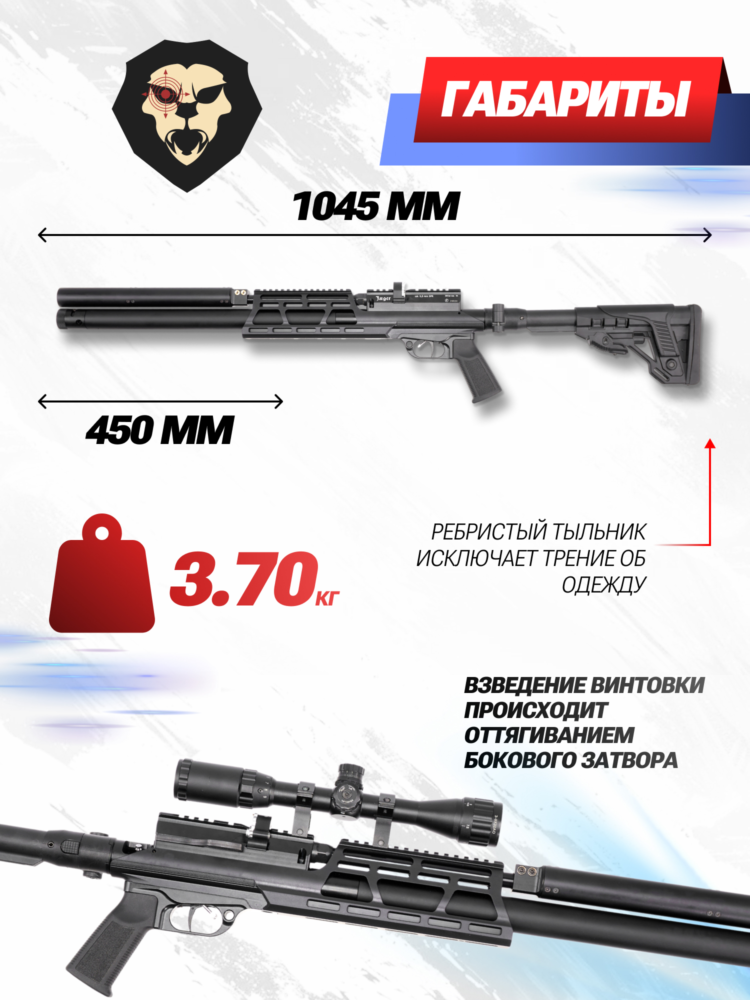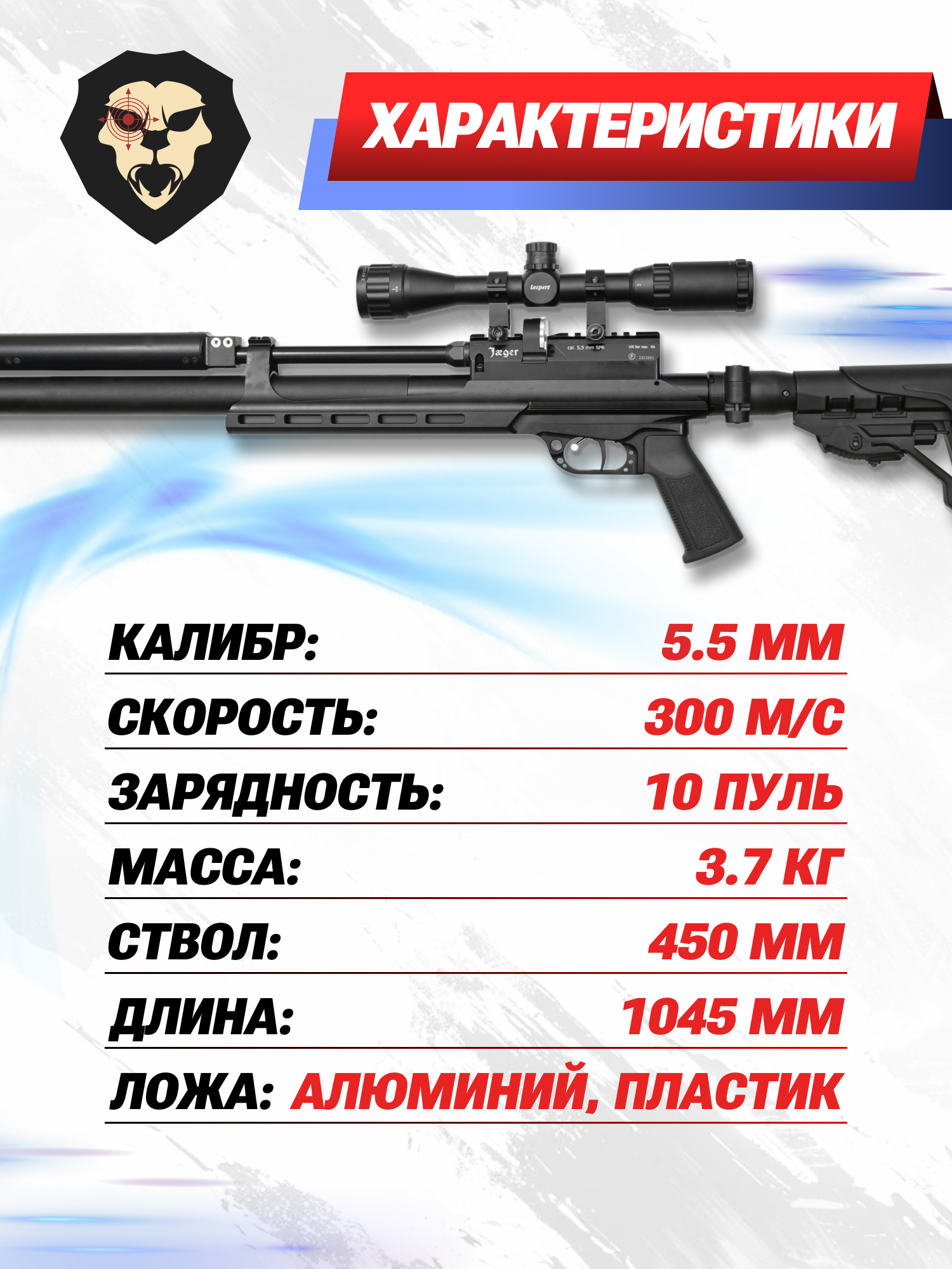 Информация о товаре "Пневматическая винтовка Jager SPR Карабин 5.5 мм (450 мм, складной, алюминиевая, LW, R255S)" носит ознакомительный характер, и не является публичной офертой, определяемой положениями Статьи 437 Гражданского кодекса Российской Федерации, характеристики, внешний вид, цвет и комплектация могут быть изменены производителем без уведомления.