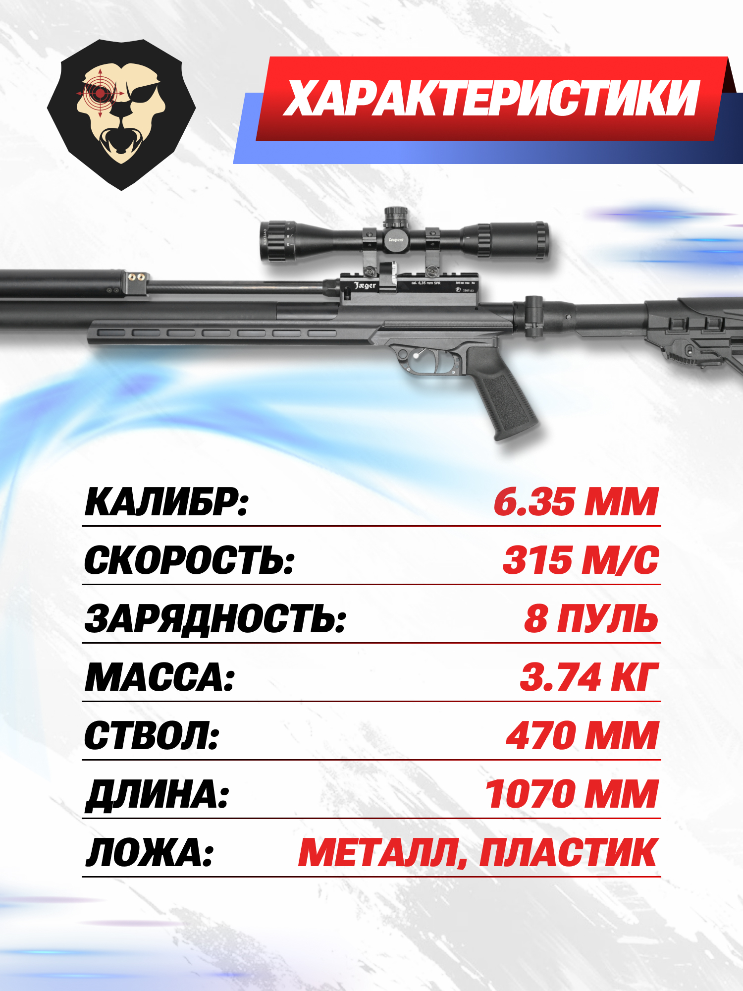 На отечественном оружейном рынке рассматриваемое изделие бренда Jager представлено с ограничением дульной энергией выстрела в рамках трех Джоулей, благодаря чему пневматика приобретается свободно, без необходимости предварительного оформления специализированных разрешительных документов. Усиленные образцы винтовки способны разгонять стандартную свинцовую пулю до скорости выше 315 метров в секунду, благодаря чему модель эффективно используются для стрельбы на дистанции в 100 метров.