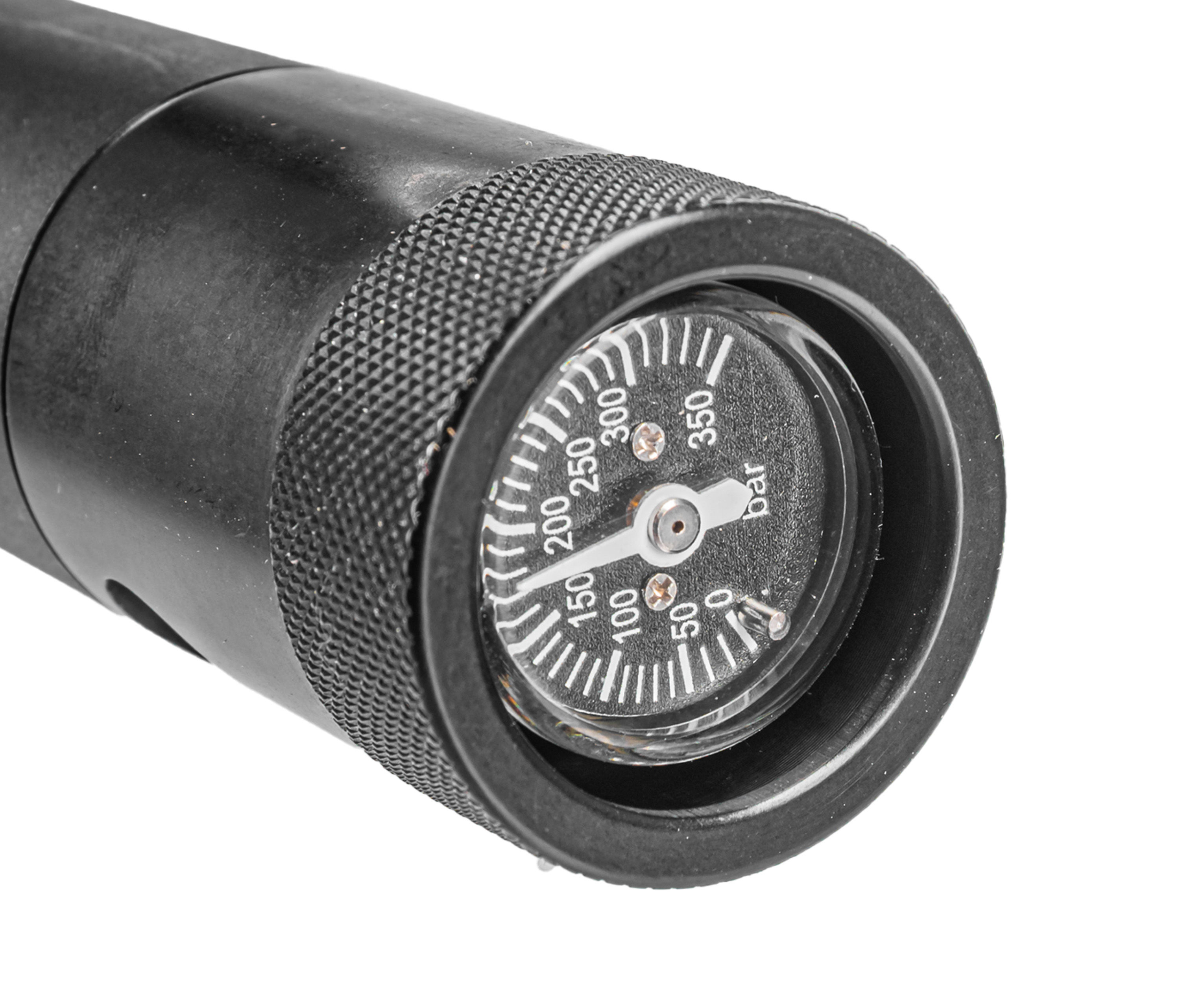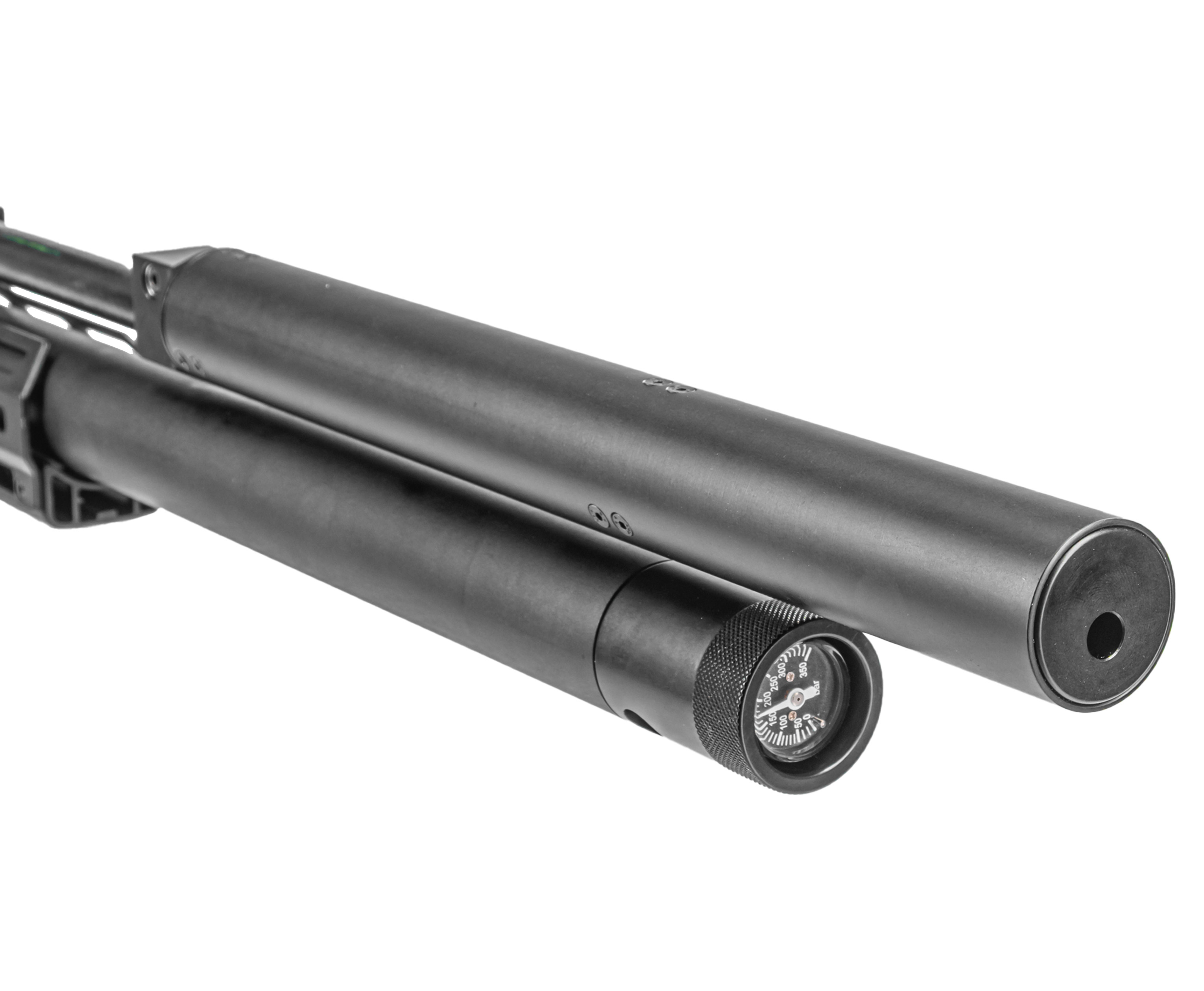Рассматриваемая модель поставляется в сборе со стандартным ресивером линейного форм-фактора, снабженным манометром. Объем последнего составляет 250 кубических сантиметров. В свою очередь допустимый верхний порог накачки системы 300 Бар - заправить резервуар можно специализированными насосами ВД, которые подсоединяются к разъему в передней части баллона, задействуя штуцер из набора.
