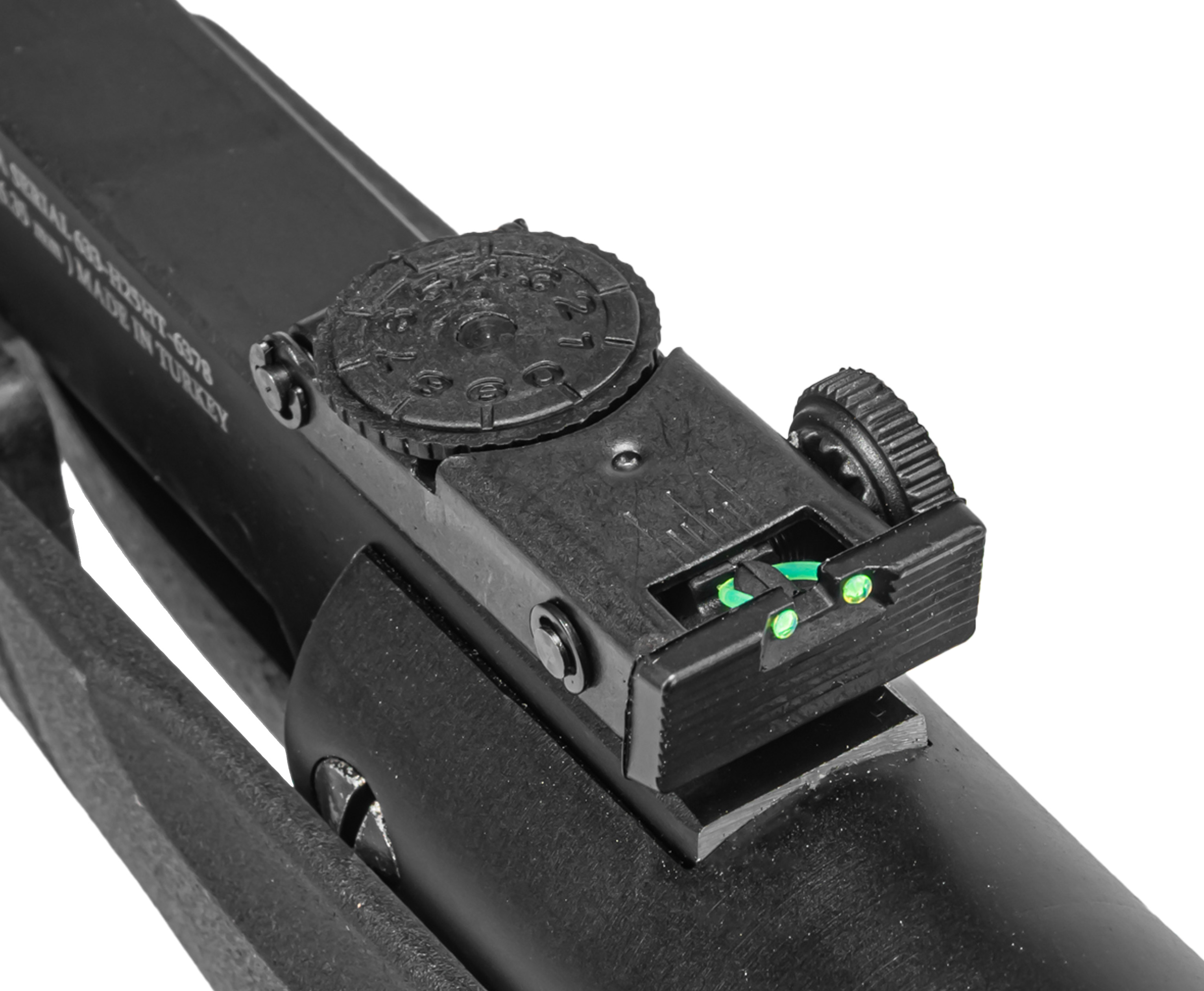 Реализовать заложенный потенциал точности помогают продуманные приспособления для наведения. По умолчанию винтовка Kral Arms снабжена мушкой и целиком открытого типа, причем последний предусматривает функцию настройки по двум осям - вдобавок элементы оформлены вставками из фибергласса, повышающими их заметность. Кроме прочего, конструкция предрасполагает к монтажу оптических приборов - желаемый обвес крепится на посадочную направляющую «Ласточкин хвост».