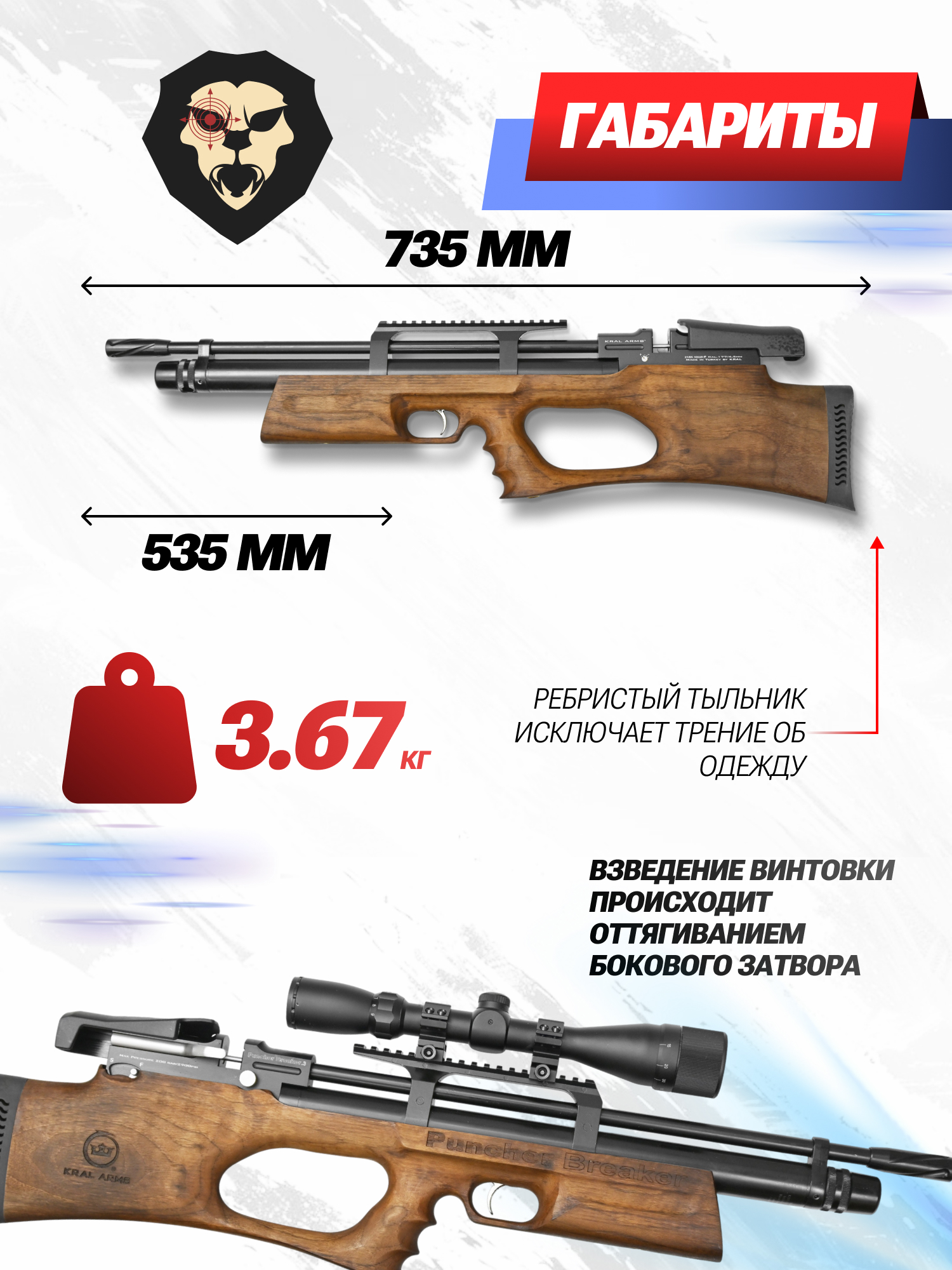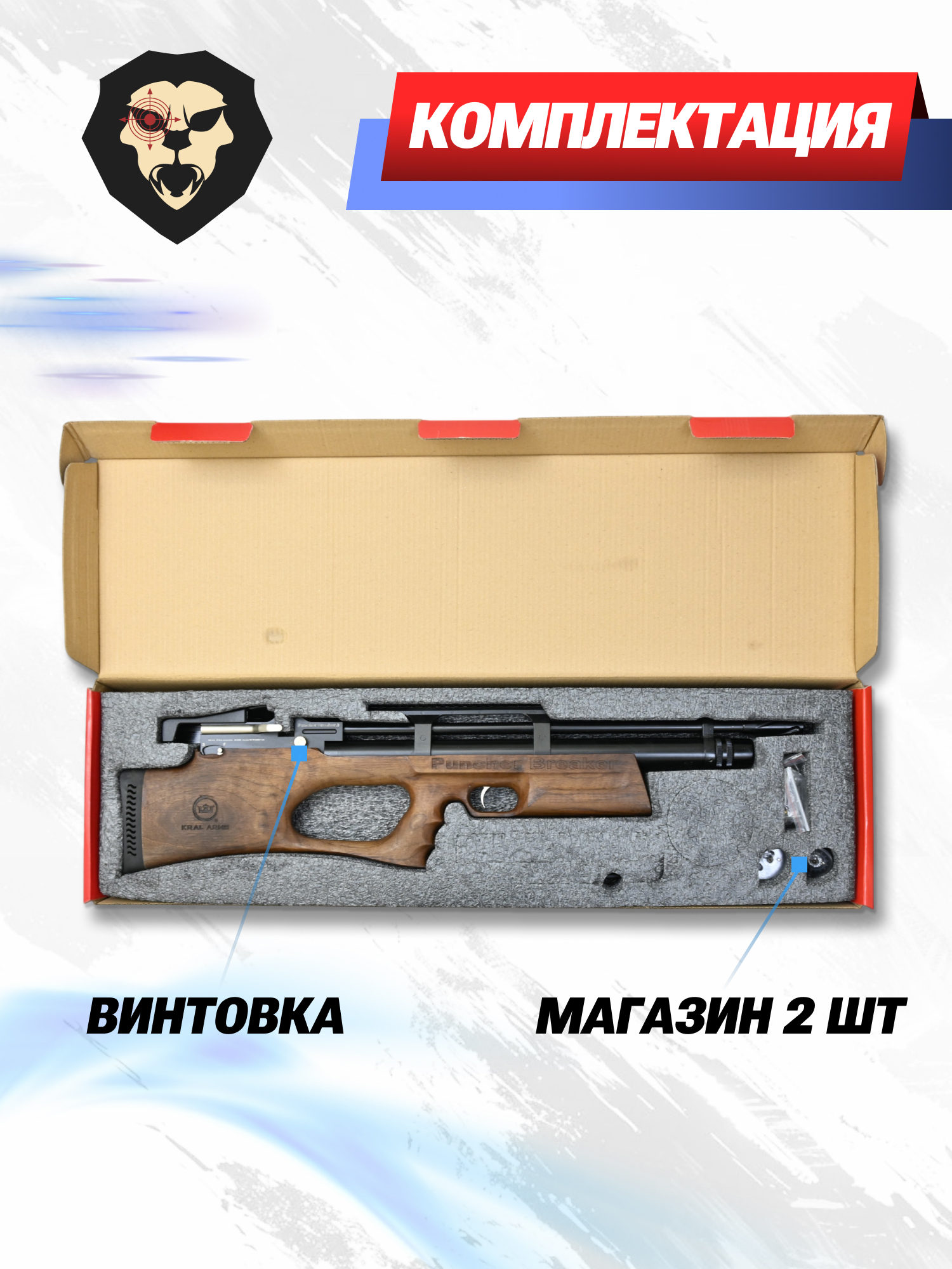 | Комплектация | Винтовка, упаковка, заправочный штуцер, краткая документация, копия сертификата (по запросу покупателя), 2 магазина |