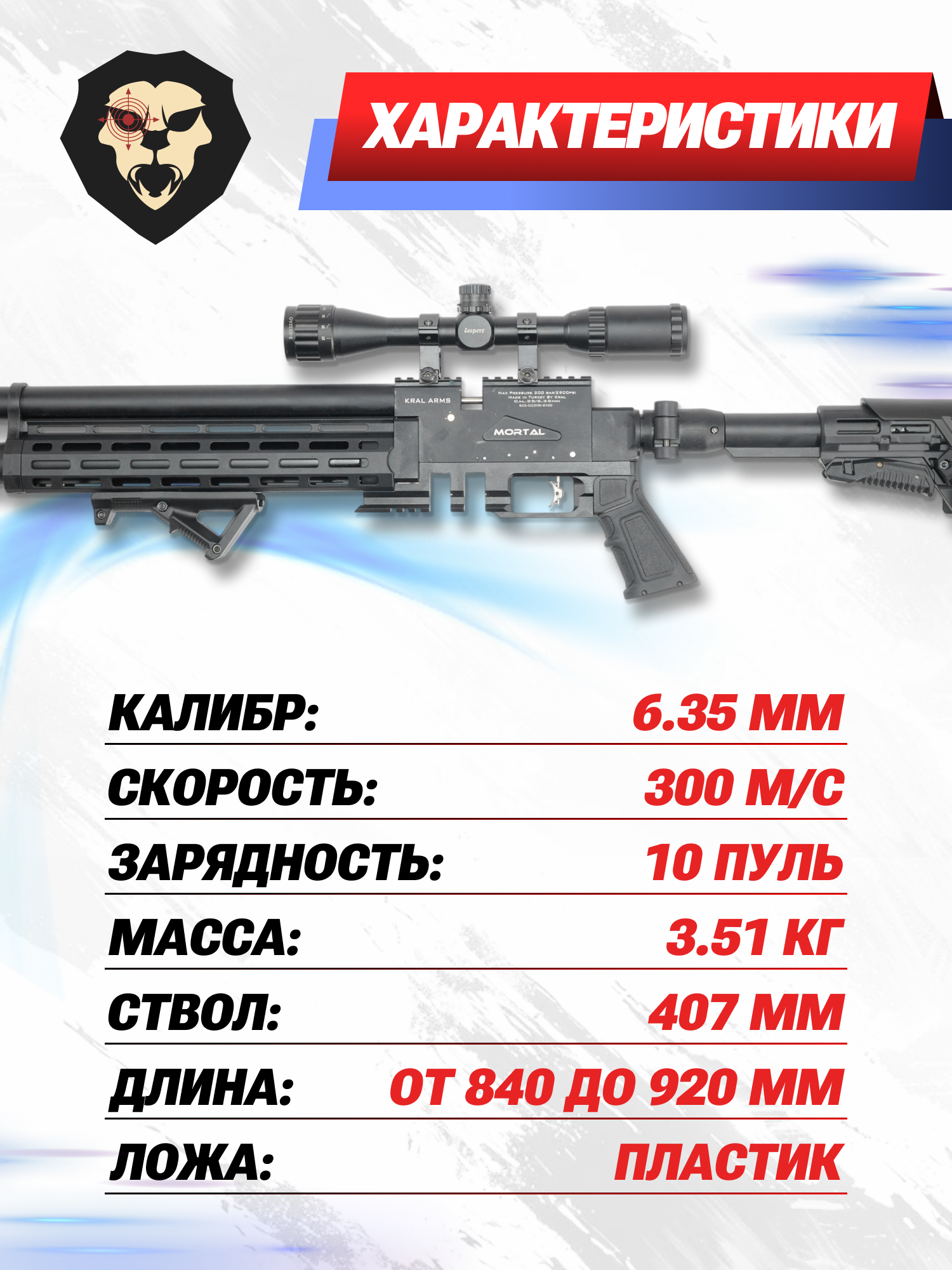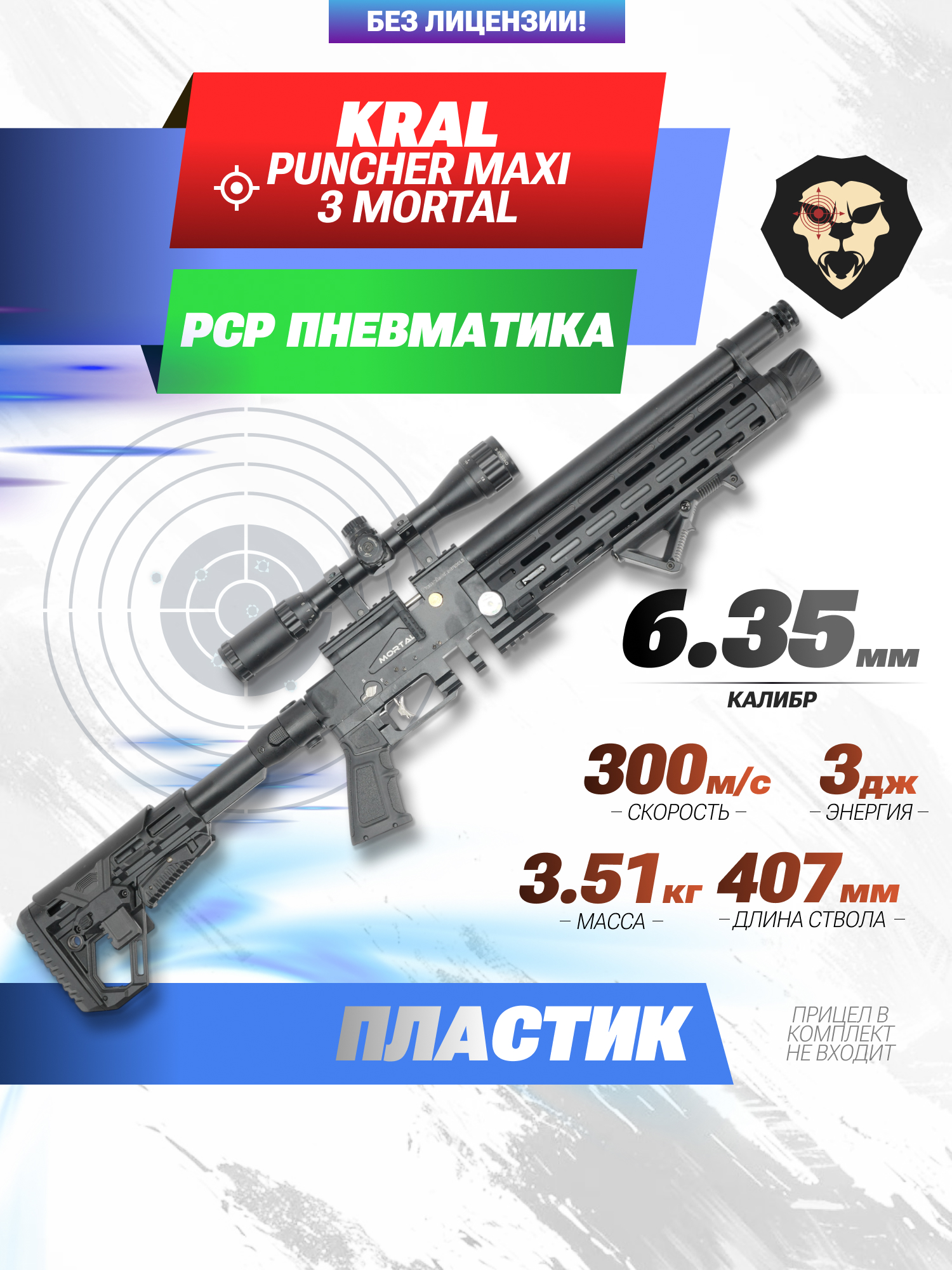 В момент выстрела пуля разгоняется до скорости выше 300 м. в секунду, что позволяет эффективно применять винтовку не только для развлекательных целей, но и профессиональных дисциплин, таких как спортивная стрельба. Для российского рынка пневматика Крал Панчер Макси 3 6.35 мм Мортал ПЦП поставляется с ограниченной дульной энергией, которая не превышает отметки в 3 Дж. При таких характеристиках изделие приобретается свободно без необходимости оформления специализированной лицензии.