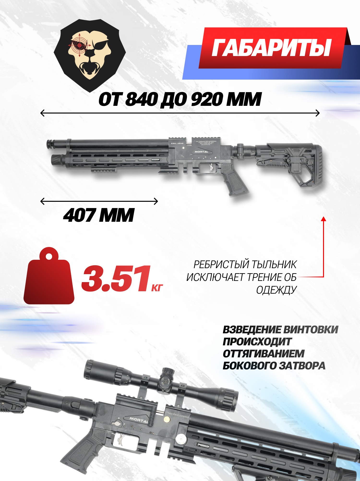 Изготовитель оснастил представленную модификацию тактическим комплектом, включающим трубчатое цевье с интерфейсом M-LOK, скрывающее резервуар, а также телескопический складной приклад с регулируемым подщечником. В комплекте с винтовкой поставляется полимерный упор с противоскользящей поверхностью, который в сочетании с эргономичной пистолетной рукоятью позволит стрелку сформировать наиболее комфортный хват вне зависимости от положения пользователя.