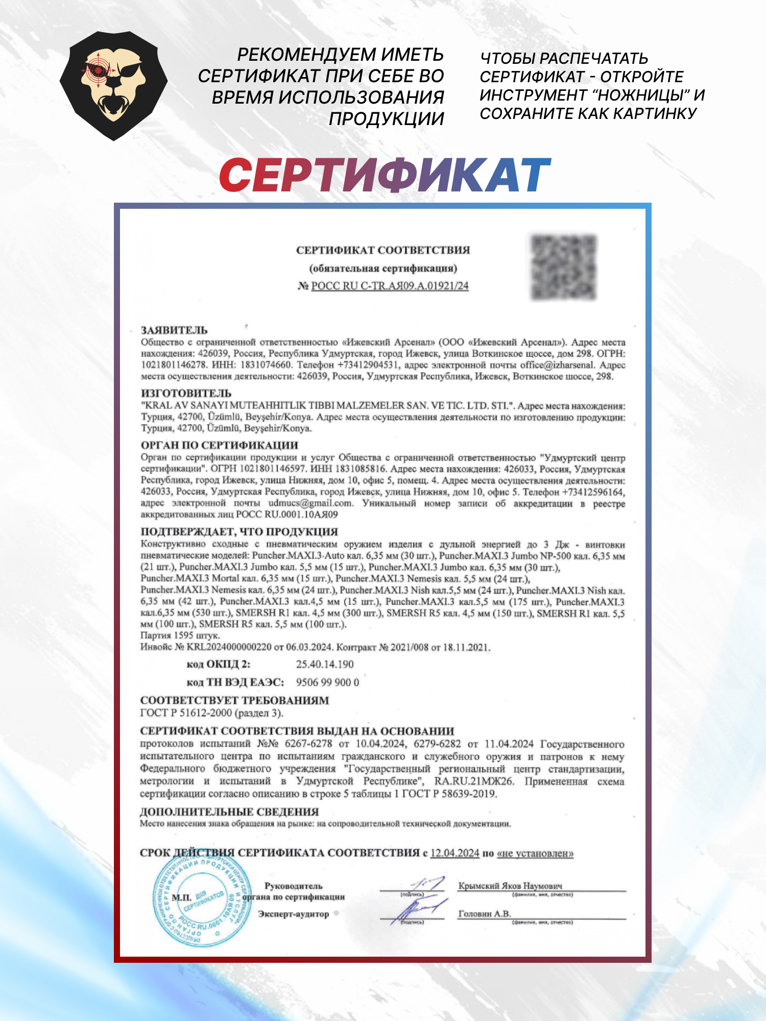 | Комплектация | Винтовка, упаковка, магазин, заправочный штуцер, краткая документация, копия сертификата (по запросу покупателя) |