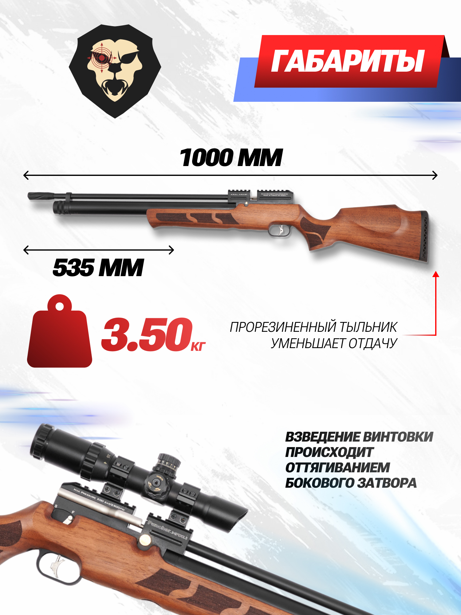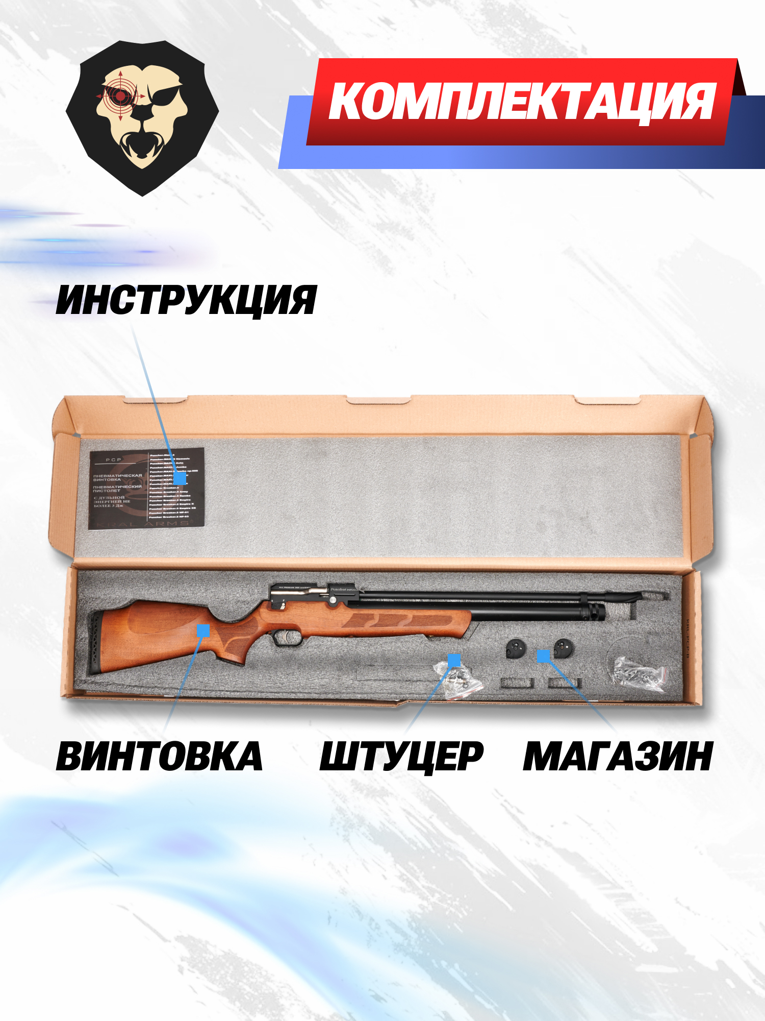 | Комплектация | Винтовка, упаковка, заправочный штуцер, краткая документация, копия сертификата (по запросу покупателя), магазин - 2 шт |