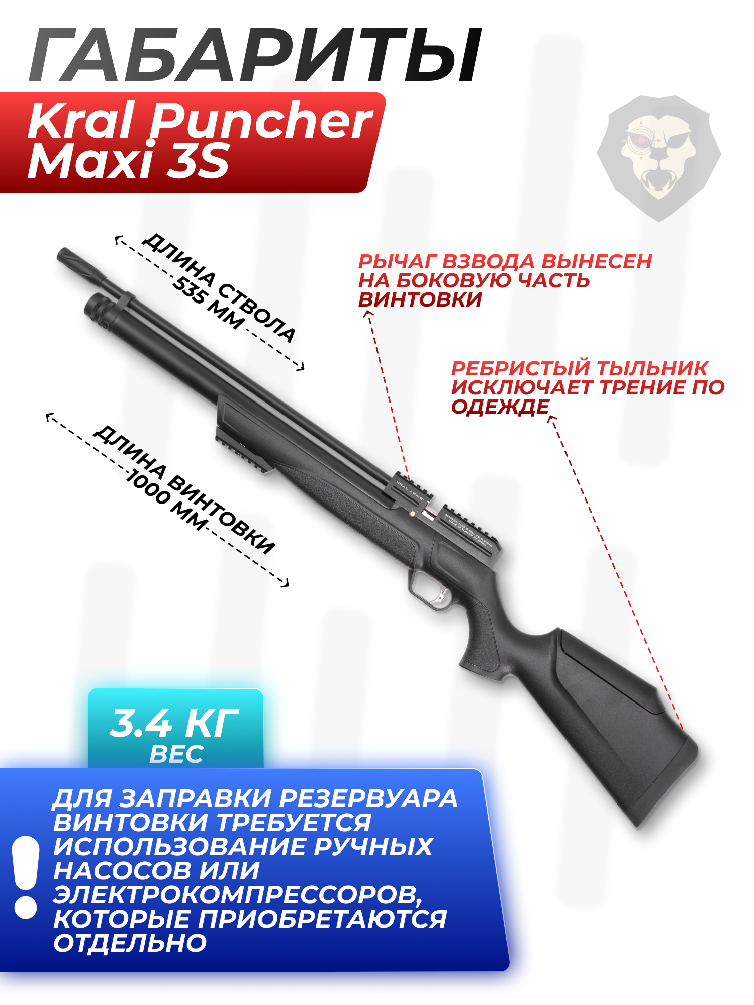 Прямоточная пневматическая винтовка Kral Puncher Maxi 3S 6.35 использует в качестве источника энергии ресивер высокого давления объемом 280 кубических сантиметров, в который закачивается воздух. Производитель рекомендует не превышать показатели давления больше 200 Бар, для этого в нижней части корпуса установлен манометр. Также стоит отметить, что комплектный резьбовой штуцер с помощью которого подключаются ручные и электрические насосы, подходящий только к некоторым образцам креплений.