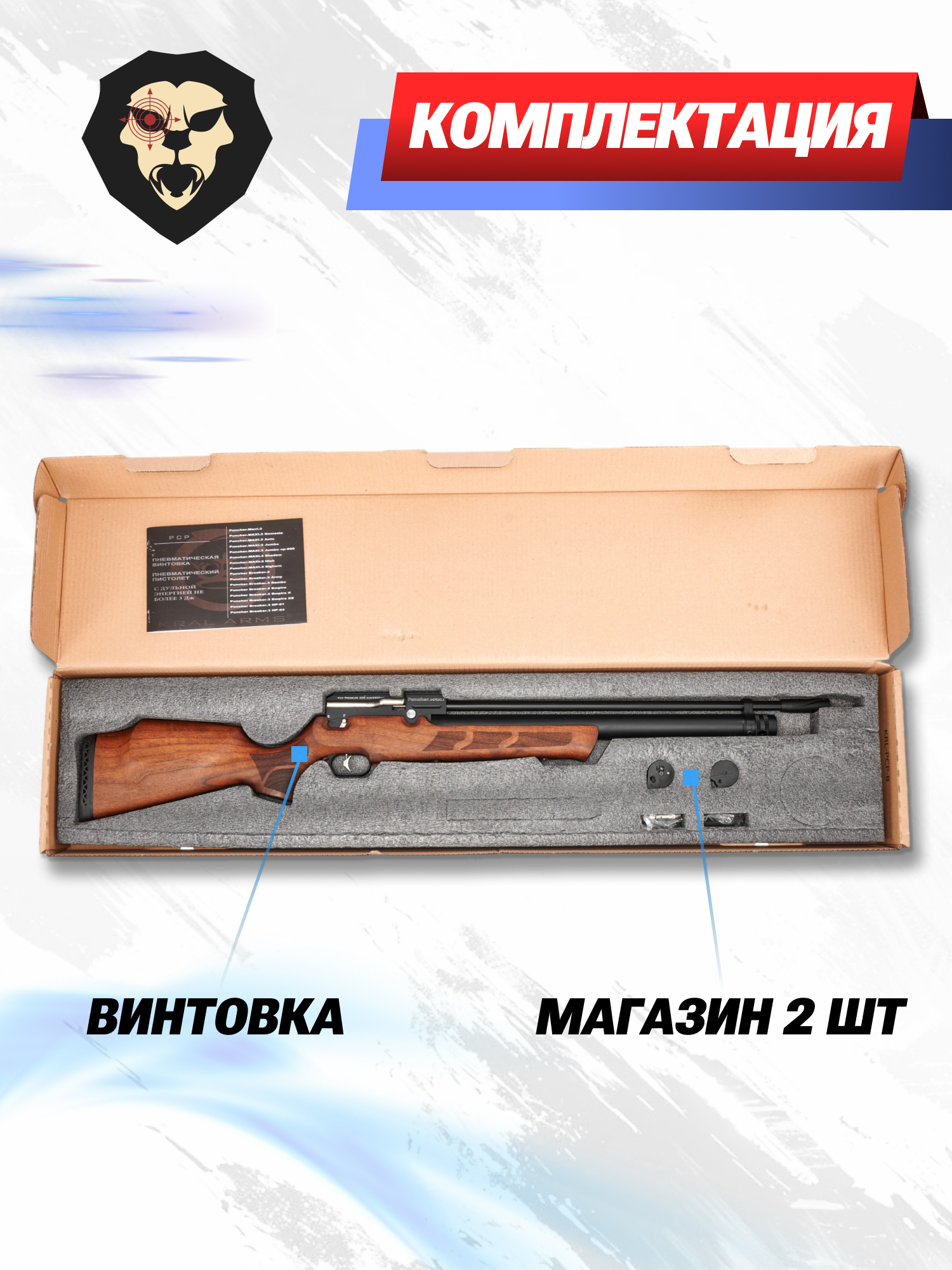 | Комплектация | Винтовка, магазин - 2 шт, планка Weaver, заправочный штуцер, пульный лоток, упаковка, краткая документация, копия сертификата (по запросу покупателя) |