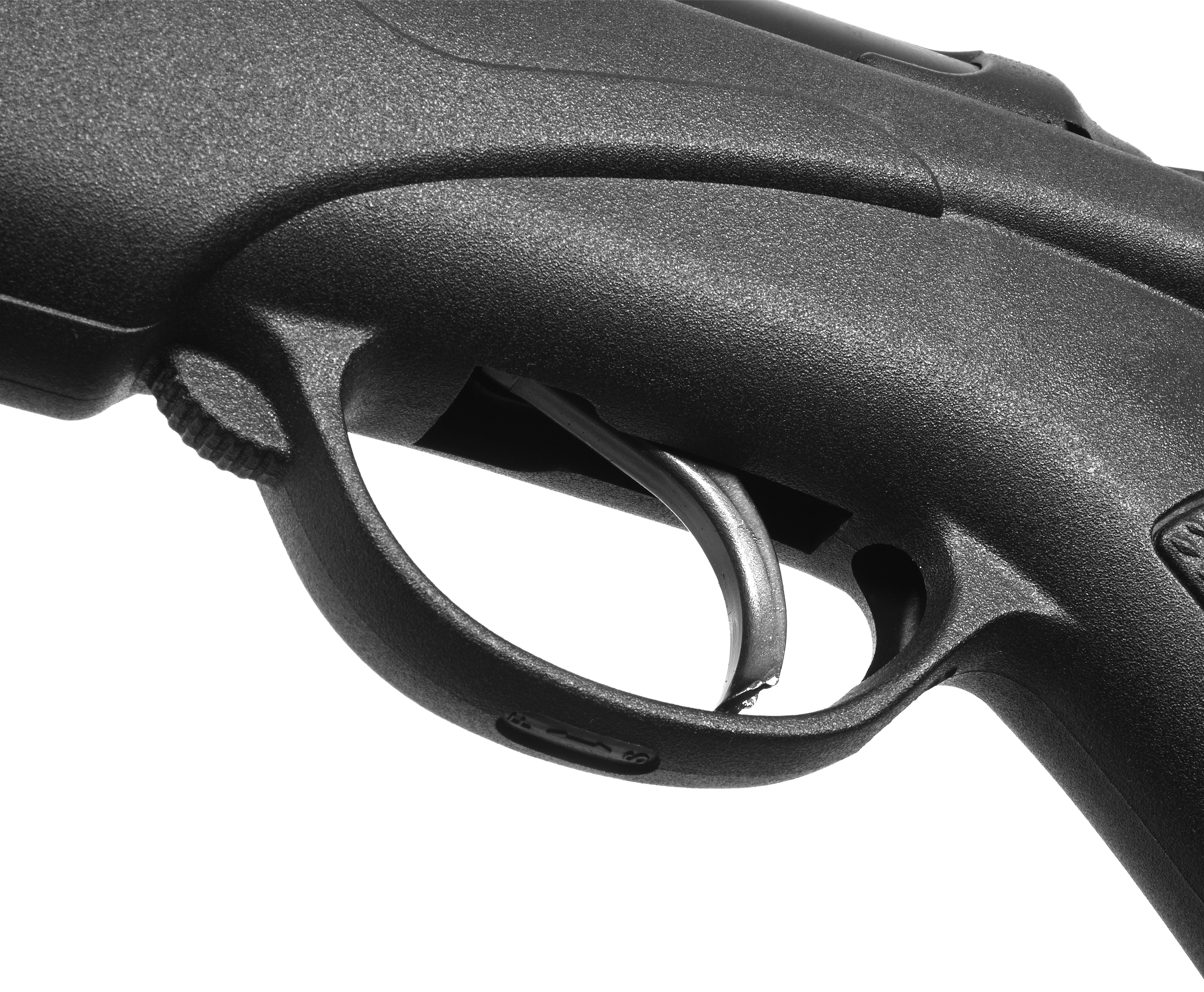 В момент запирания ствола после заряжания, автоматически срабатывает предохранитель, исключающий случайный выстрел. Чтобы нажать на спуск, потребуется сбросить блокировку путем взаимодействия с клавишей на торце коробки. Такое расположение переключателя позволяет провести манипуляции, не нарушая вкладку в прицел.