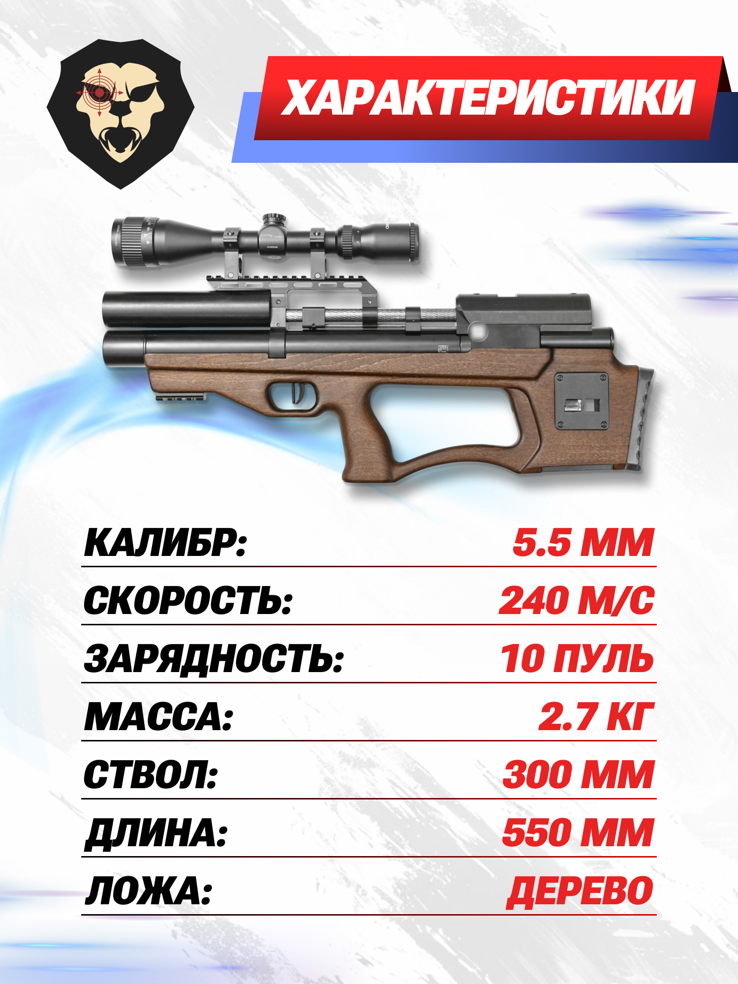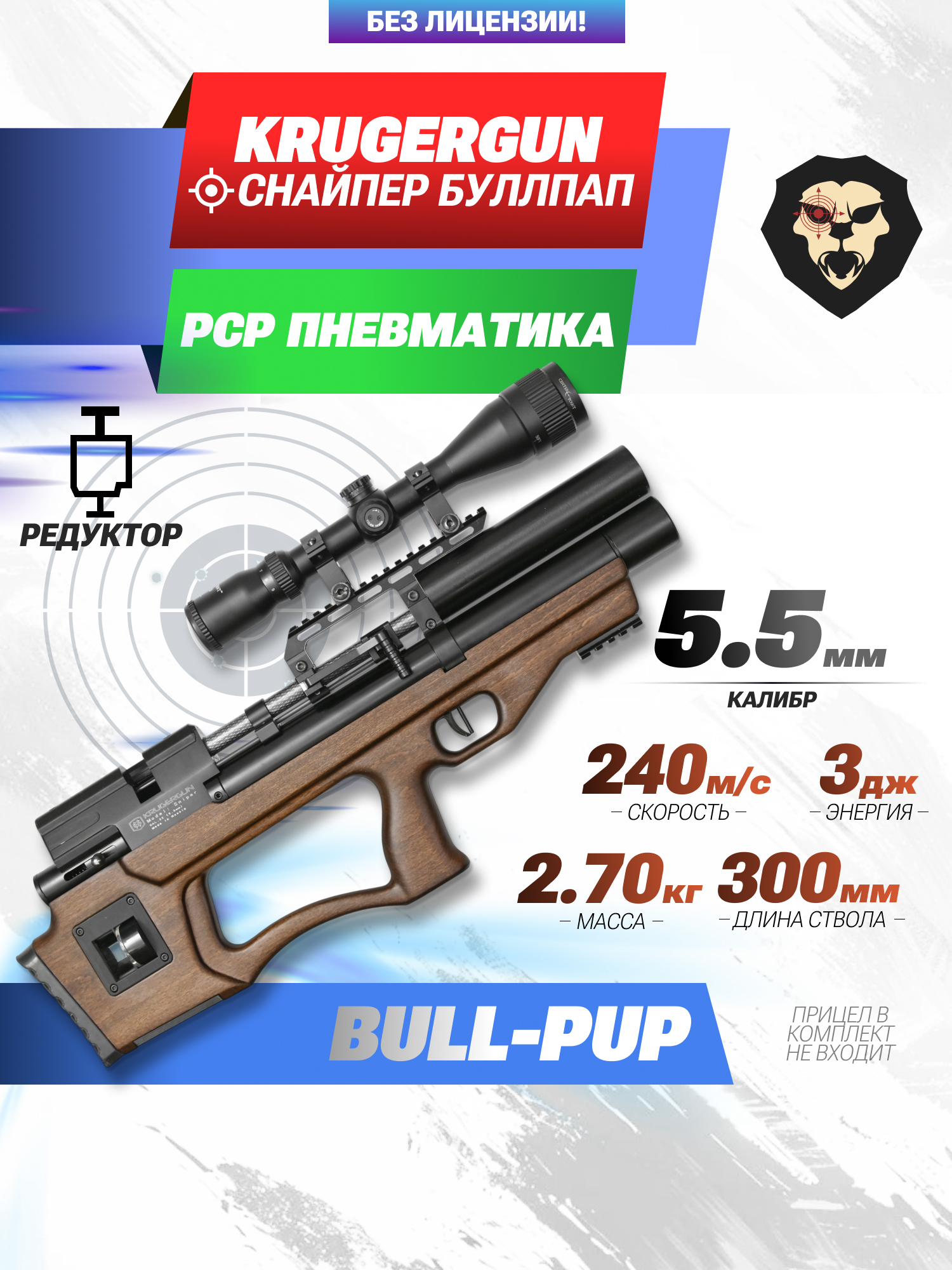 Информация о товаре "Пневматическая винтовка Krugergun 5.5 мм Снайпер Bullpup (300 мм, передний взвод, редуктор, высокий мостик, дерево)" носит ознакомительный характер, и не является публичной офертой, определяемой положениями Статьи 437 Гражданского кодекса Российской Федерации, характеристики, внешний вид, цвет и комплектация могут быть изменены производителем без уведомления.