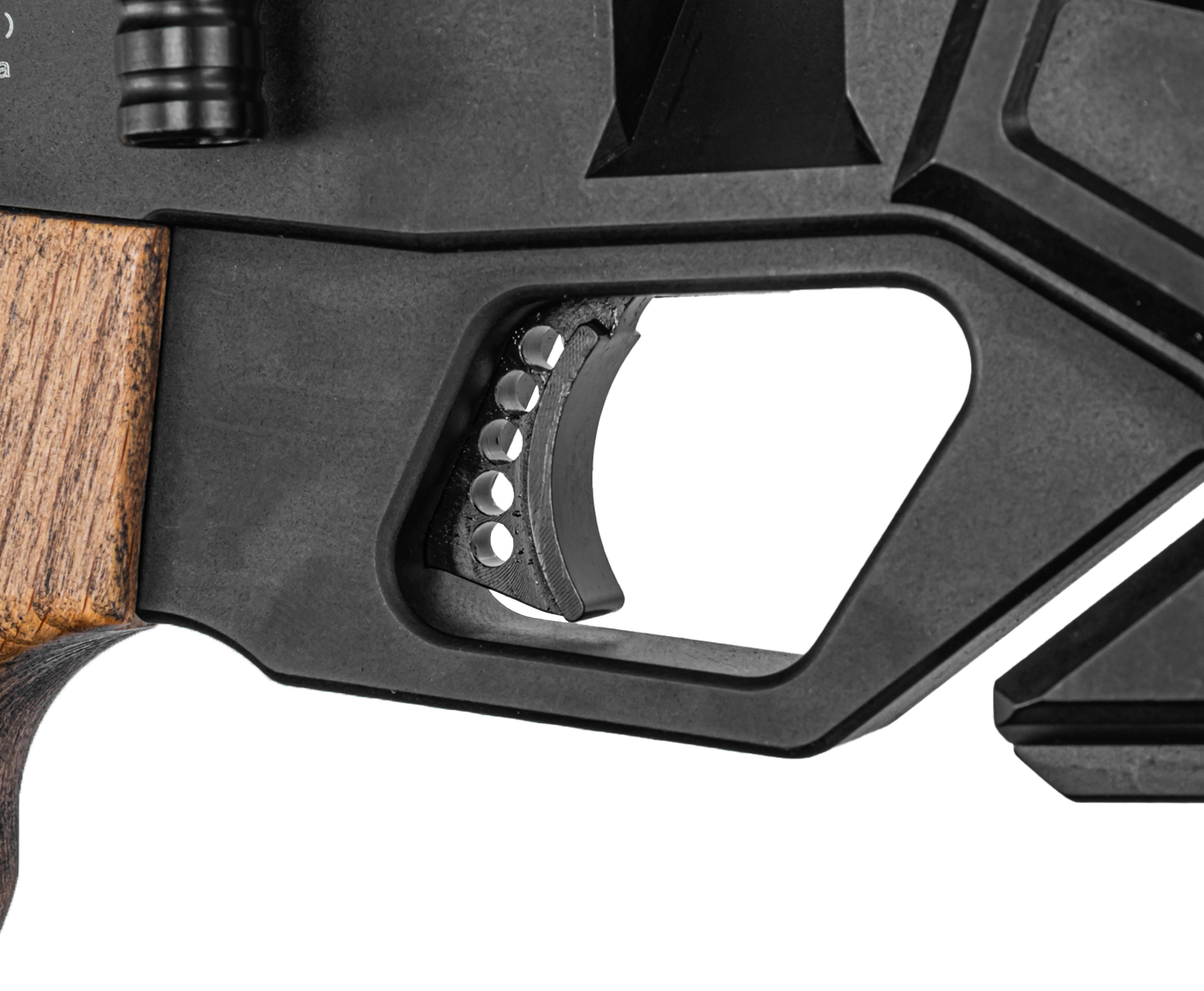 Пневматическая винтовка KrugerGun Корсар оснащается двумя планками Weaver 22 мм. Первая – расположена под резервуаром и служит для монтажа тактических устройств, таких как лазерный целеуказатель или фонарь. Вторая планка, установленная над стволом изделия, несет функцию крепежной линии для оптики и других прицельных приспособлений. Для безопасной эксплуатации винтовки на правой стороне установлен предохранитель, блокирующий движение спускового триггера