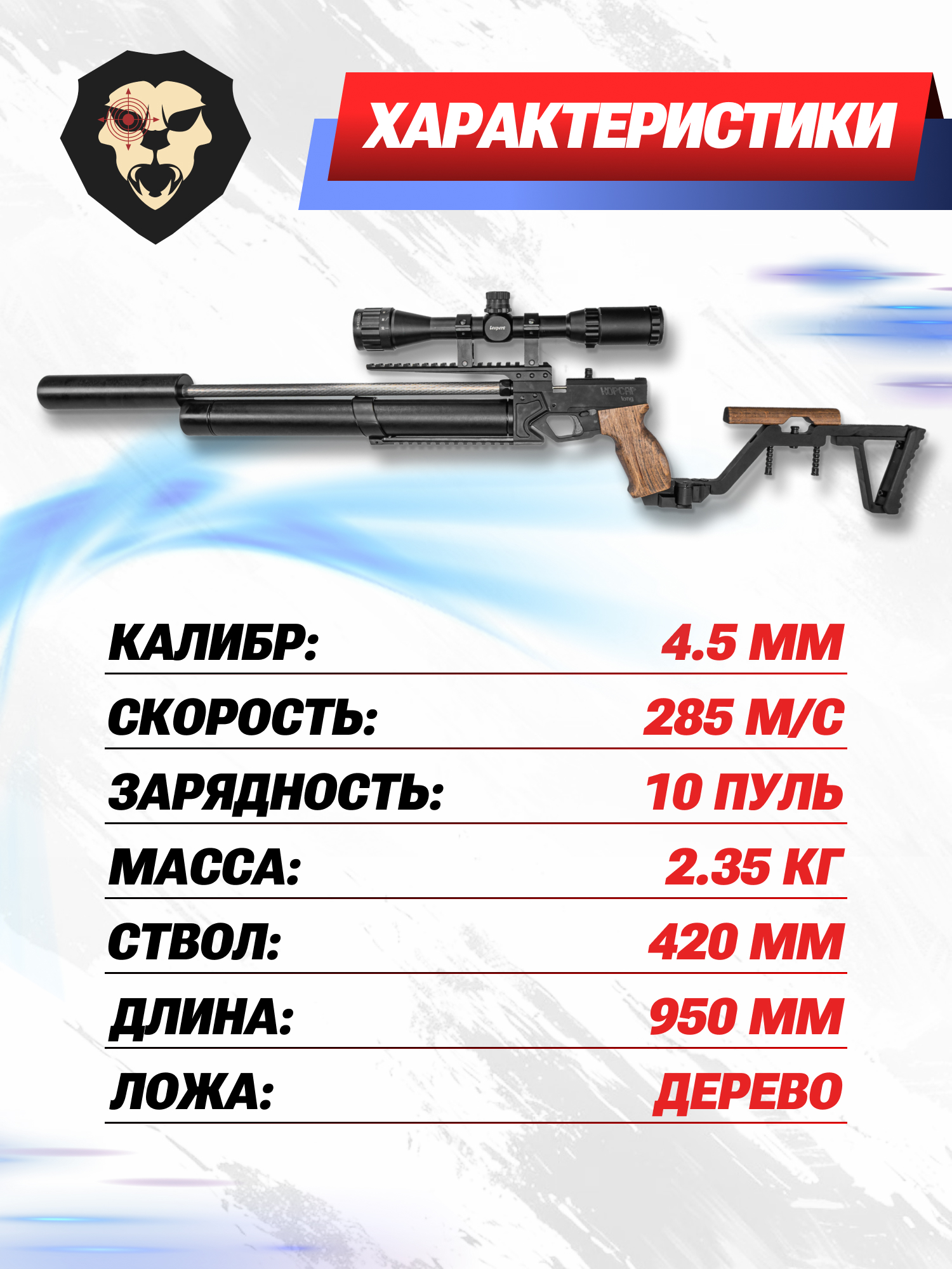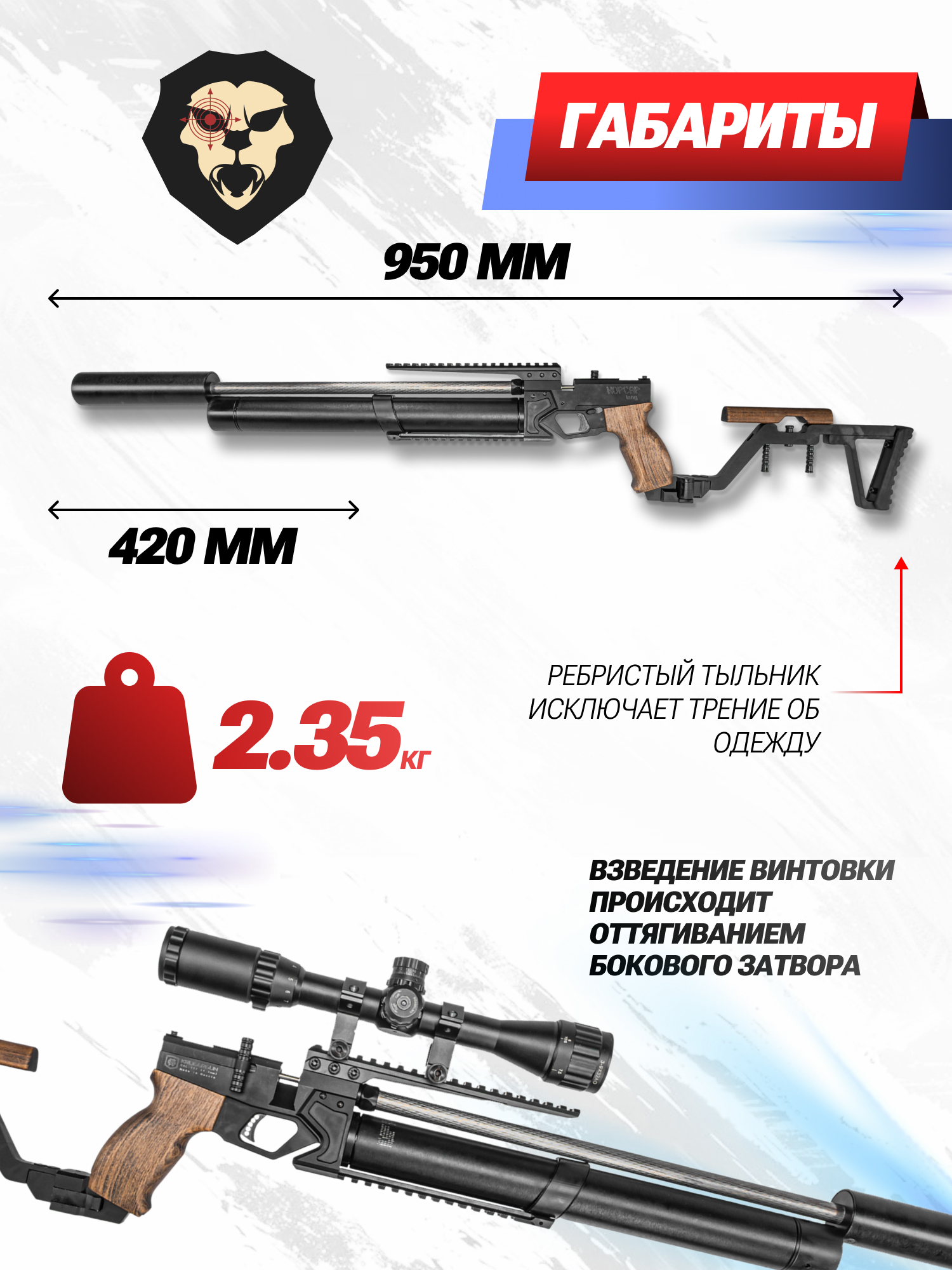| Комплектация | Винтовка, магазин, съемный приклад, набор ЗИП, упаковка, заправочный штуцер, краткая документация, копия сертификата (по запросу покупателя) |