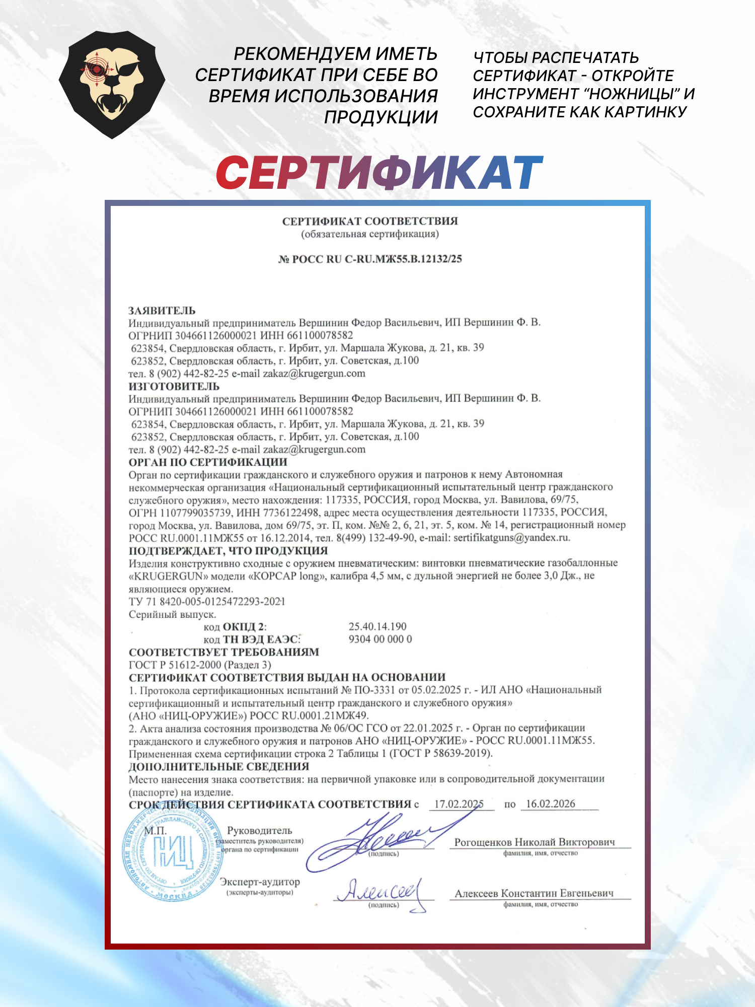 Информация о товаре "Пневматическая винтовка KrugerGun Корсар 4.5 мм (прямоток, 420 мм, дерево)" носит ознакомительный характер, и не является публичной офертой, определяемой положениями Статьи 437 Гражданского кодекса Российской Федерации, характеристики, внешний вид, цвет и комплектация могут быть изменены производителем без уведомления.