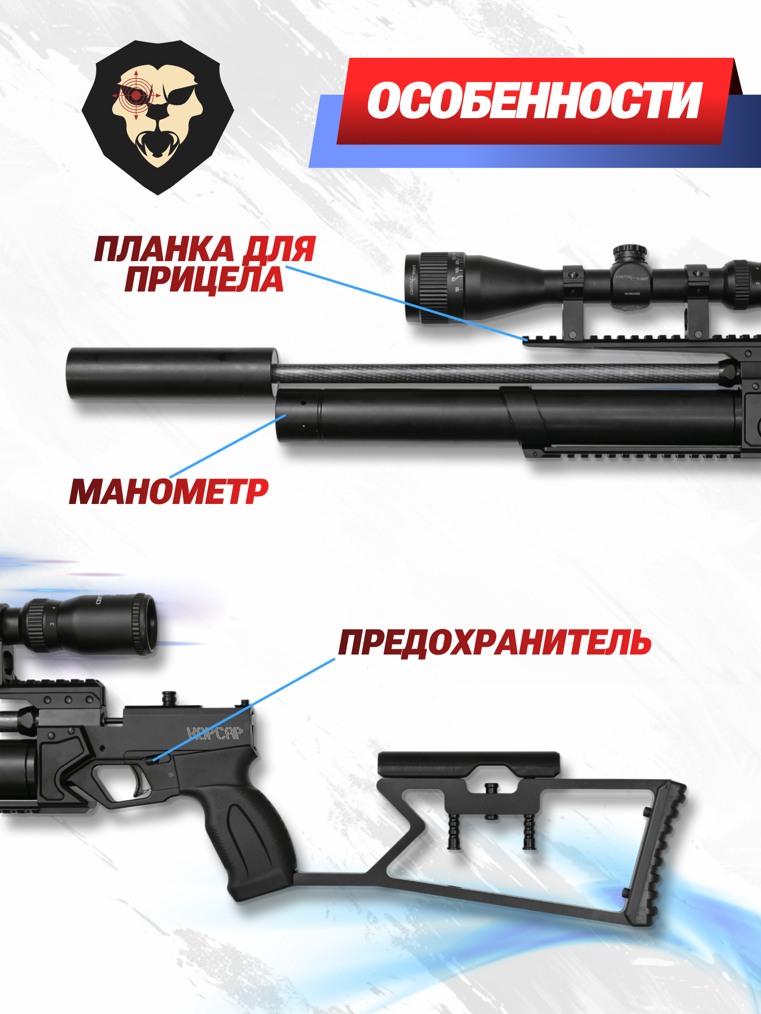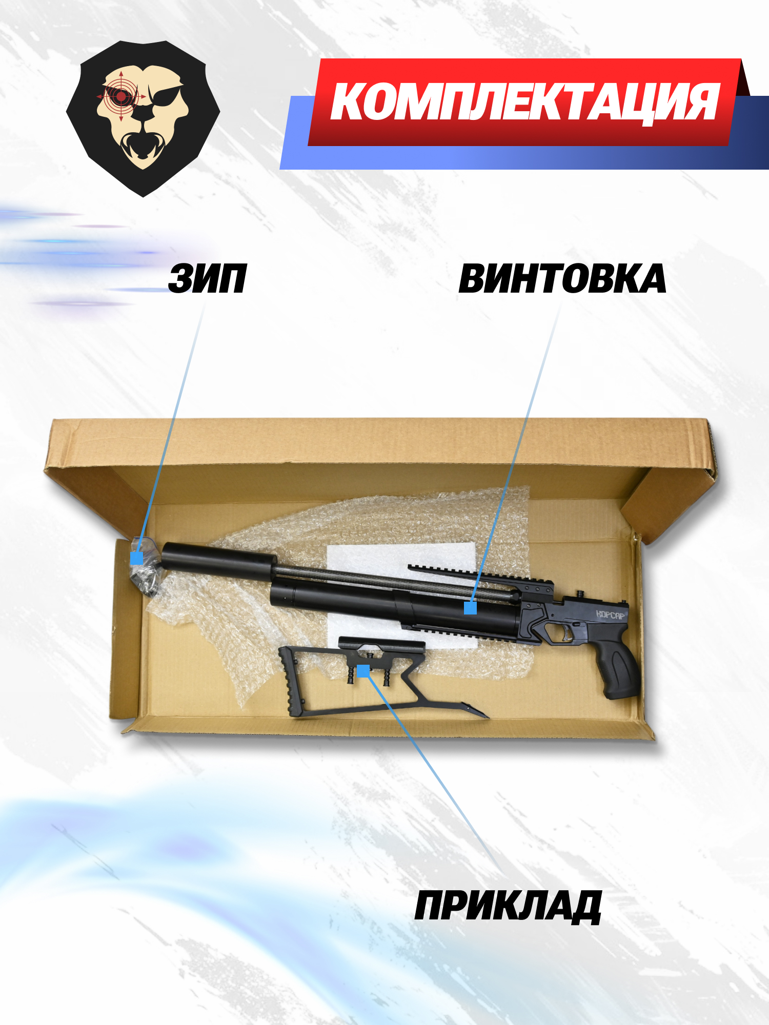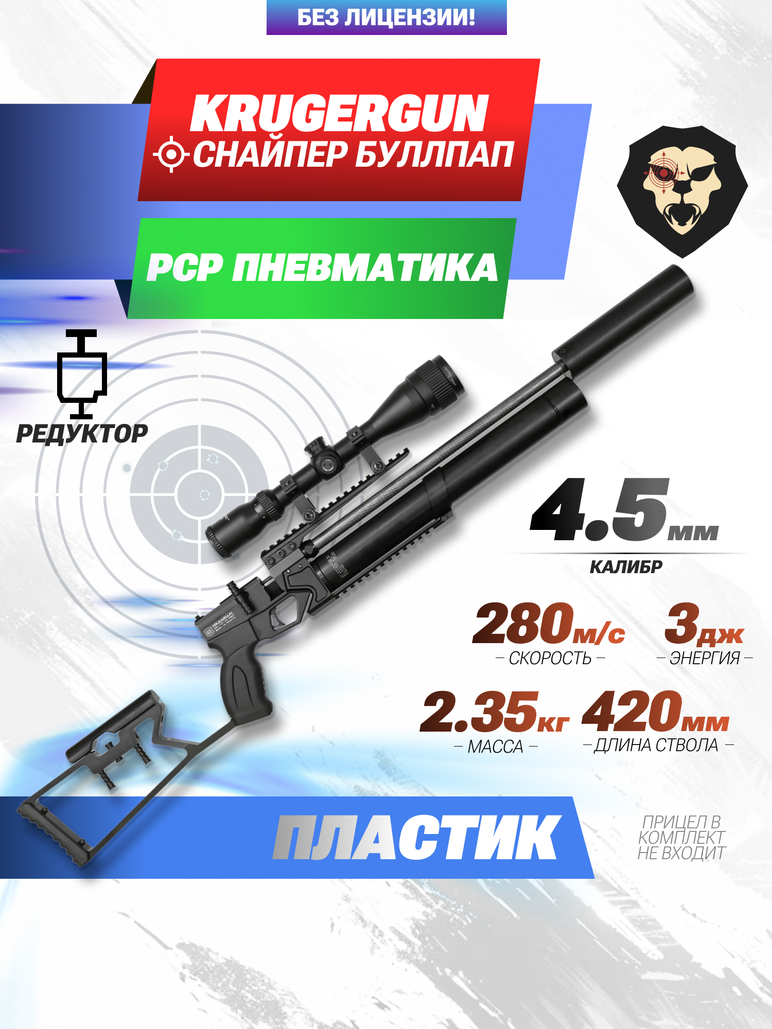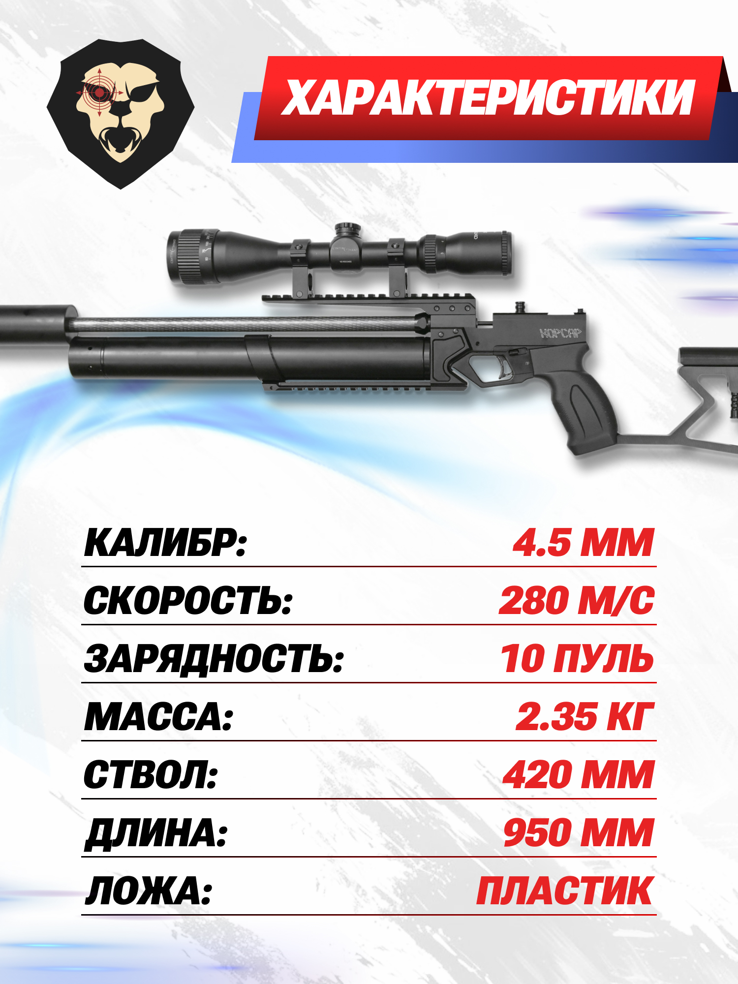 Информация о товаре "Пневматическая винтовка KrugerGun Корсар 4.5 мм (редуктор, 420 мм)" носит ознакомительный характер, и не является публичной офертой, определяемой положениями Статьи 437 Гражданского кодекса Российской Федерации, характеристики, внешний вид, цвет и комплектация могут быть изменены производителем без уведомления.