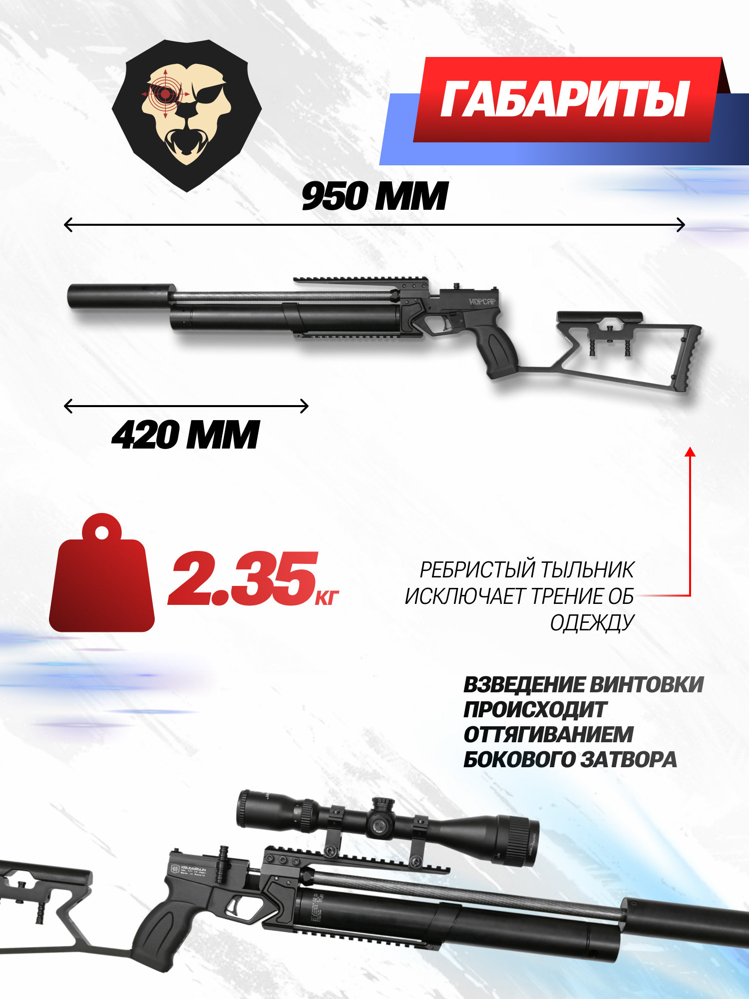 Благодаря скелетной конструкции приклада винтовки Корсар KrugerGun вес изделия сокращается до 2.35 кг. В сочетании с возможностью разборки, получаем изделие, которое не занимает много места с небольшим весом и модульностью конструкции.
