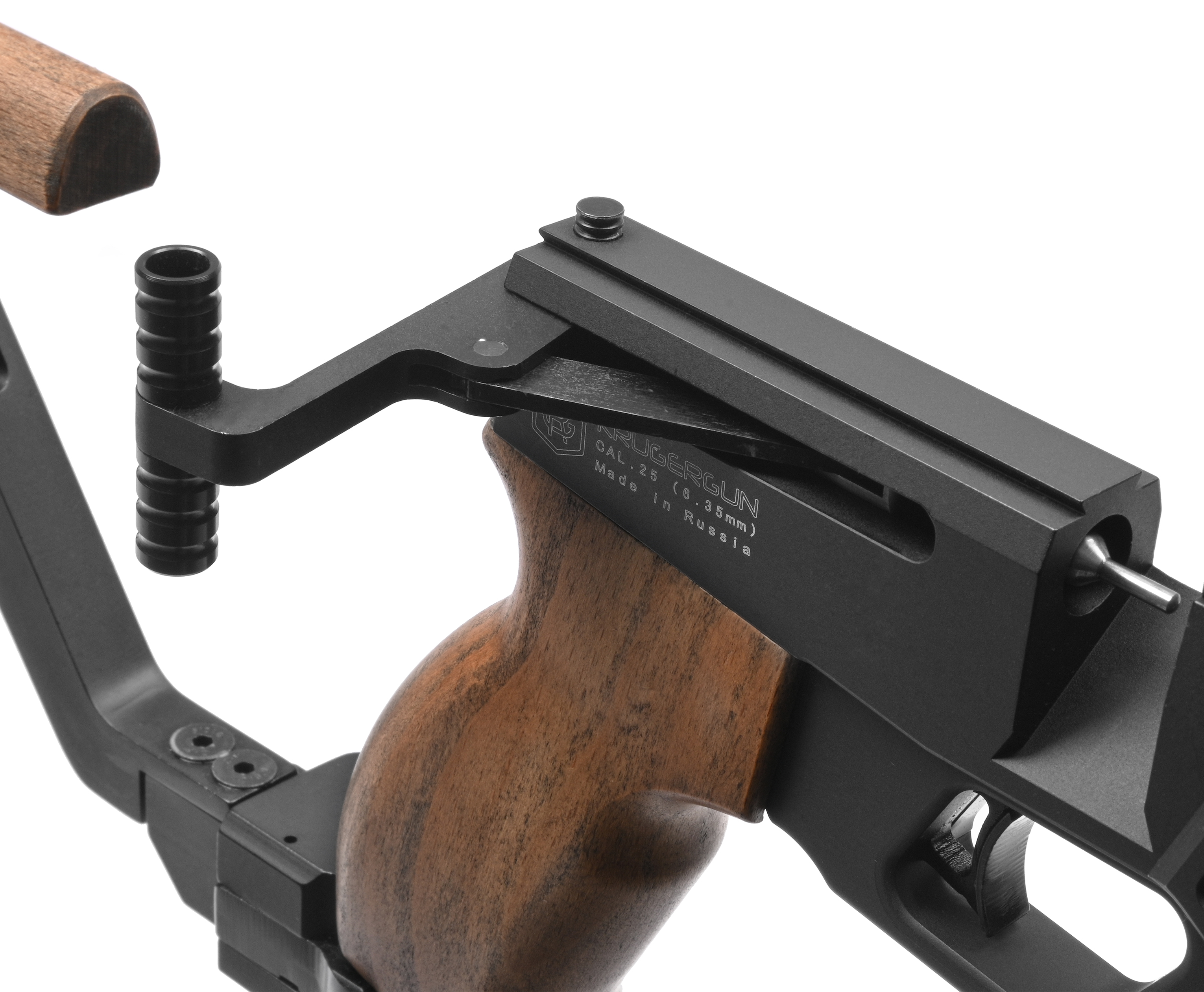 Механизм PCP пневматики подразумевает использование специальных баллонов, которые выполняют роль резервуара для накачки сжатого воздуха. На рассматриваемой пневматической винтовке предусмотрен цилиндрический ресивер вместимостью 277 кубических сантиметров. В момент выстрела пружина ударника Крюгера Корсар отвечает за силу удара по пропускному клапану, что влияет на количество воздуха, которое поступает в ствол.