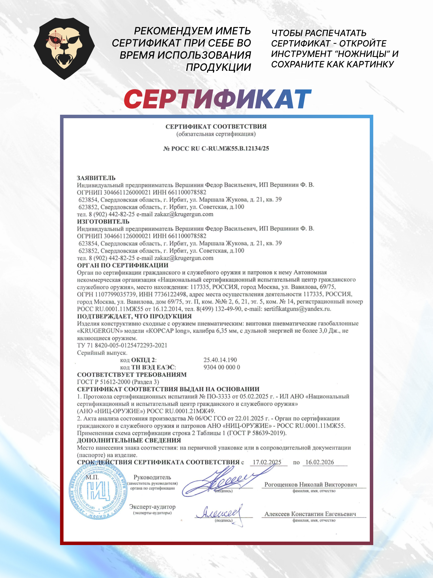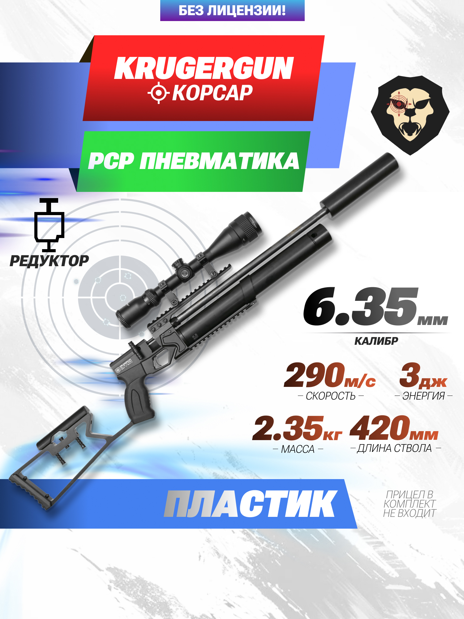 Информация о товаре "Пневматическая винтовка KrugerGun Корсар 6.35 мм (редуктор, 420 мм)" носит ознакомительный характер, и не является публичной офертой, определяемой положениями Статьи 437 Гражданского кодекса Российской Федерации, характеристики, внешний вид, цвет и комплектация могут быть изменены производителем без уведомления.
