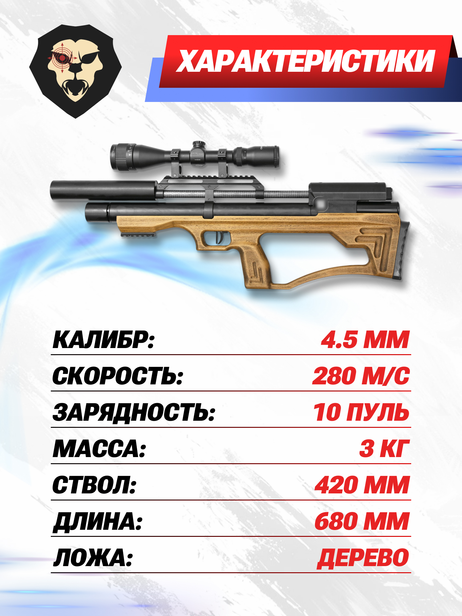 Информация о товаре "Пневматическая винтовка Krugergun Снайпер 4.5 мм Буллпап (420 мм, редуктор, резервуар 430, дерево L)" носит ознакомительный характер, и не является публичной офертой, определяемой положениями Статьи 437 Гражданского кодекса Российской Федерации, характеристики, внешний вид, цвет и комплектация могут быть изменены производителем без уведомления.