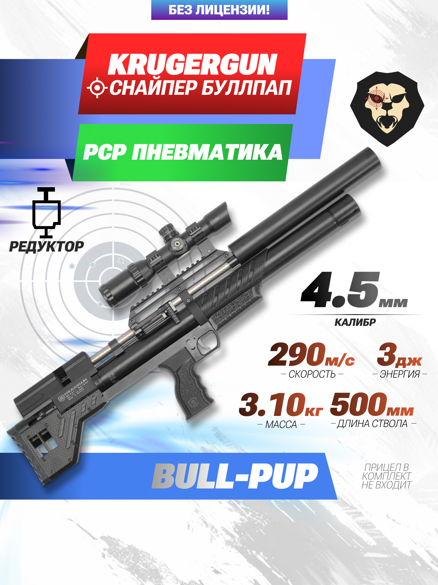 Информация о товаре "Пневматическая винтовка Krugergun Снайпер 4.5 мм Bullpup (500 мм, редуктор, взвод передний, пластик, резервуар 510)" носит ознакомительный характер, и не является публичной офертой, определяемой положениями Статьи 437 Гражданского кодекса Российской Федерации, характеристики, внешний вид, цвет и комплектация могут быть изменены производителем без уведомления.