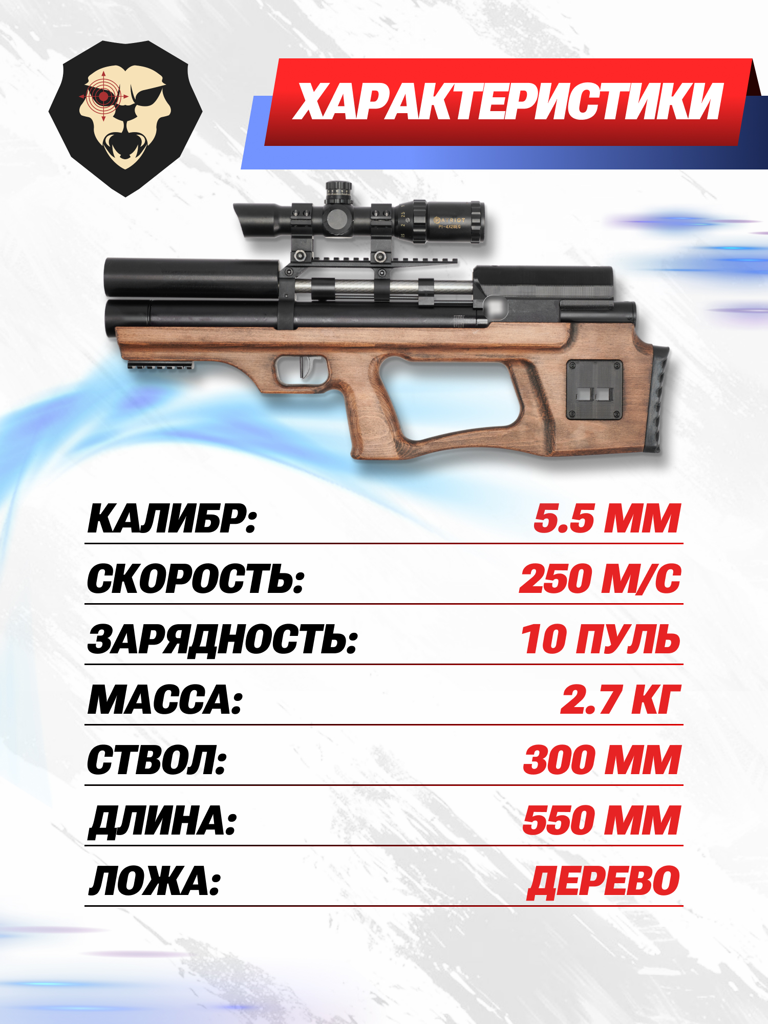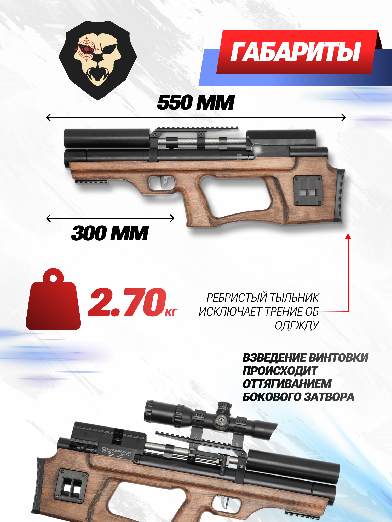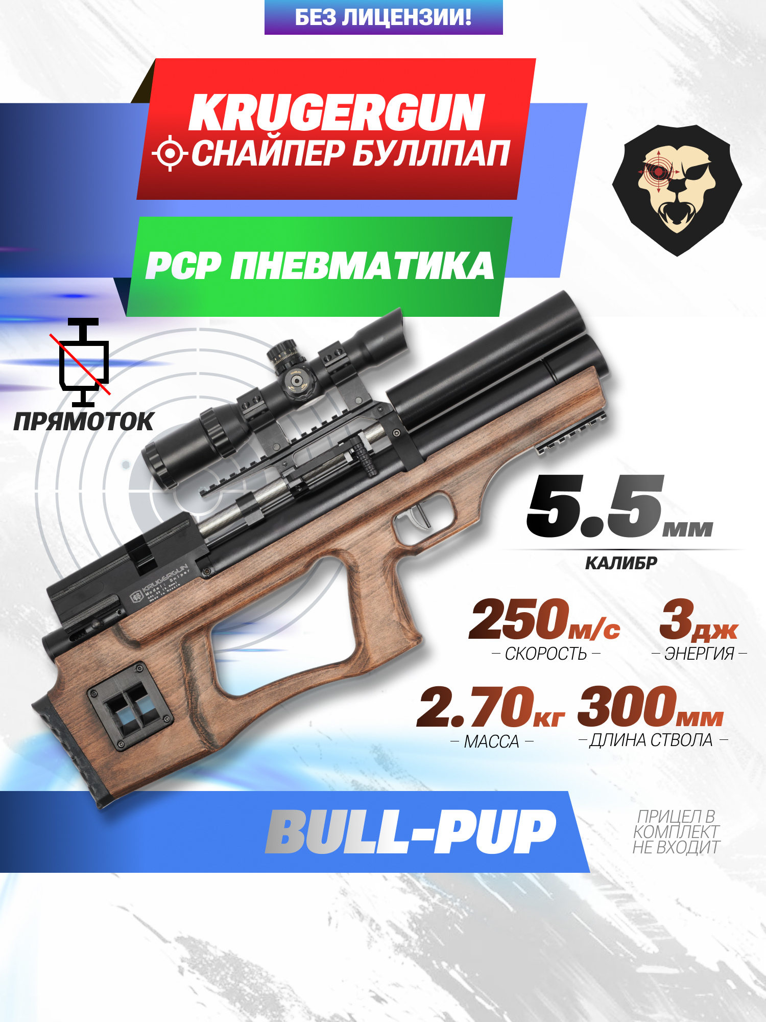 Информация о товаре "Пневматическая винтовка Krugergun Снайпер 5.5 мм Буллпап (300 мм, прямоток, дерево, передний взвод)" носит ознакомительный характер, и не является публичной офертой, определяемой положениями Статьи 437 Гражданского кодекса Российской Федерации, характеристики, внешний вид, цвет и комплектация могут быть изменены производителем без уведомления.