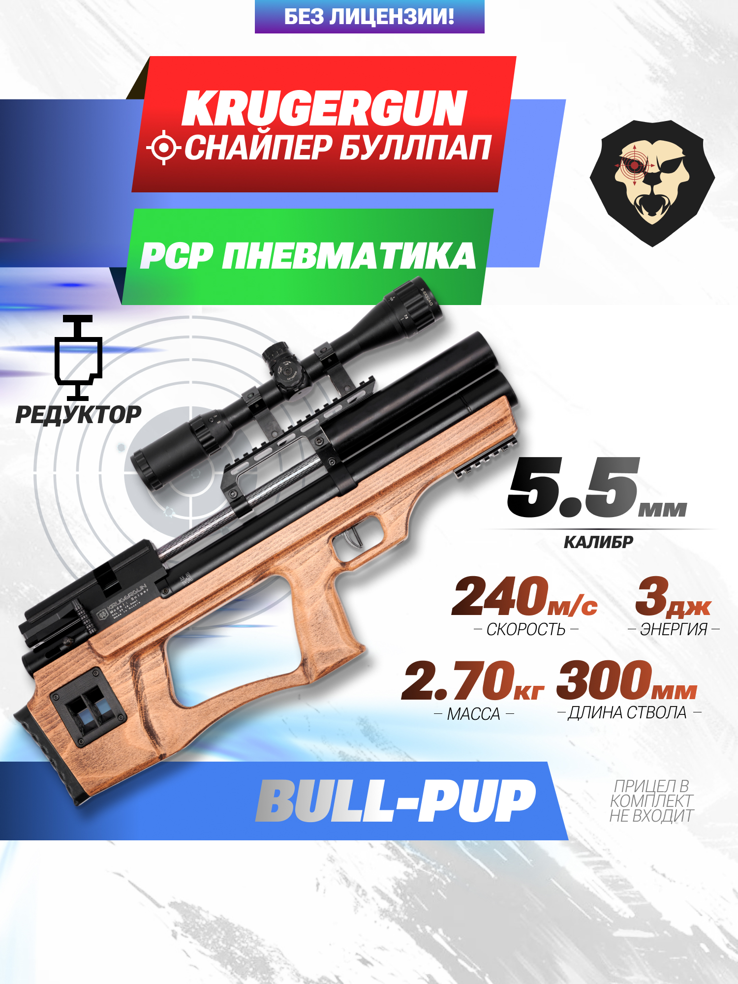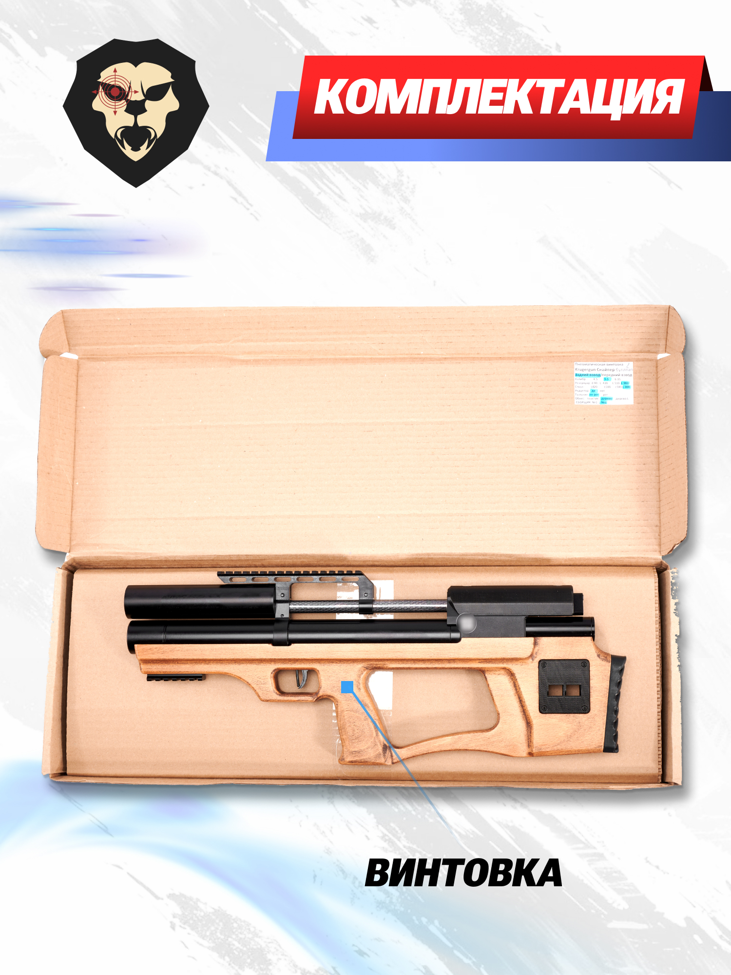 Информация о товаре "Пневматическая винтовка Krugergun Снайпер 5.5 мм Буллпап (300 мм, редуктор, высокий мостик, дерево)" носит ознакомительный характер, и не является публичной офертой, определяемой положениями Статьи 437 Гражданского кодекса Российской Федерации, характеристики, внешний вид, цвет и комплектация могут быть изменены производителем без уведомления.
