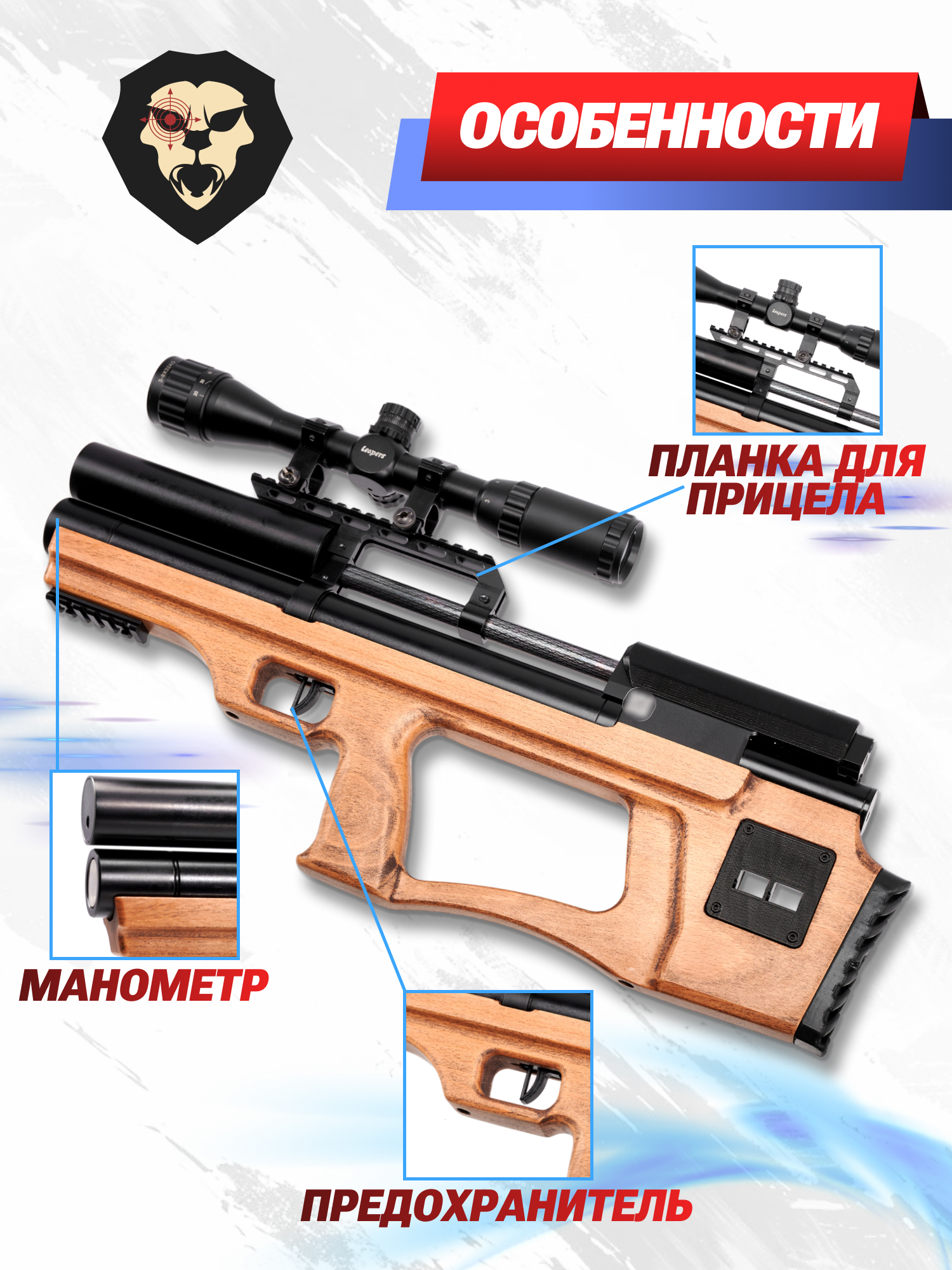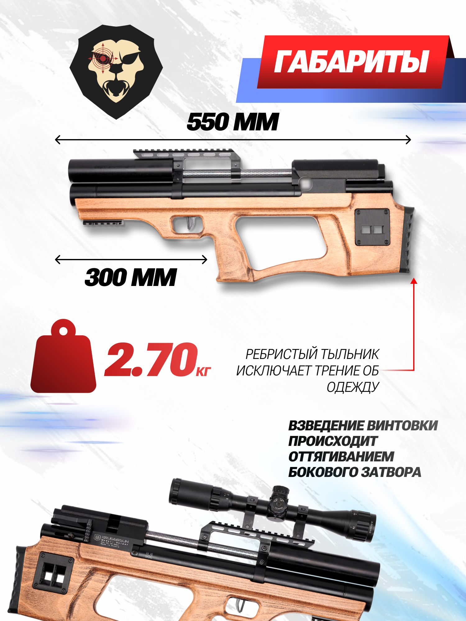 Эстетически привлекательный и классический внешний вид винтовке KrugerGun 5.5 Снайпер придает деревянная ложа. Сохранить внешний вид деревянных узлов изделия помогут некоторые оружейные средства такие как баллистол, который можно приобрести в нашем интернет-магазине PopadiV10. Частью ложа является деревянная пистолетная рукоять с комфортным углом захвата, позволяющим удерживать пневматику даже одной рукой.