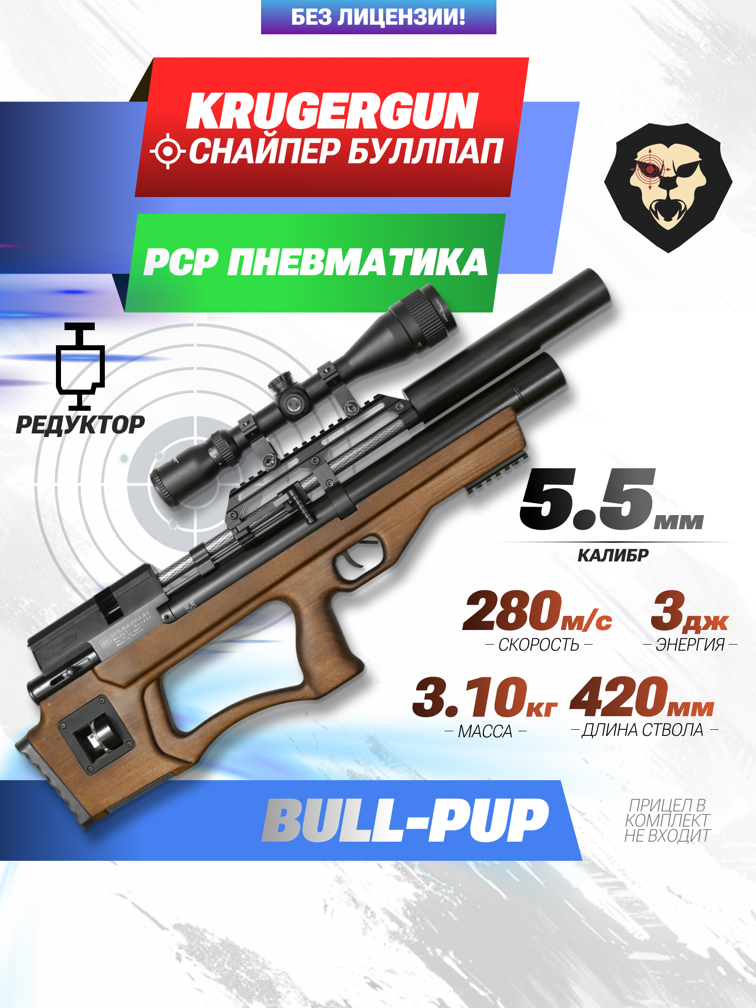 Информация о товаре "Пневматическая винтовка Krugergun Снайпер 5.5 мм Буллпап (420 мм, редуктор, взвод передний, деревянная)" носит ознакомительный характер, и не является публичной офертой, определяемой положениями Статьи 437 Гражданского кодекса Российской Федерации, характеристики, внешний вид, цвет и комплектация могут быть изменены производителем без уведомления.