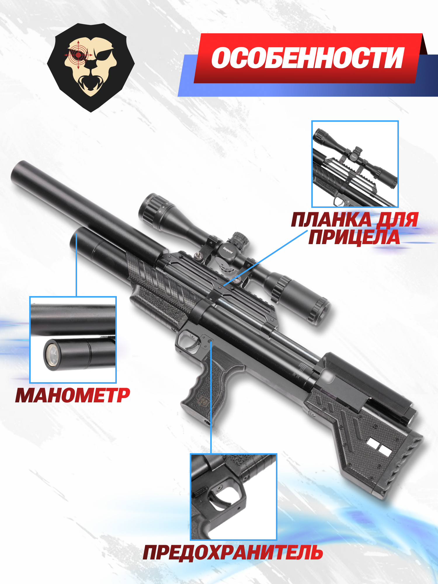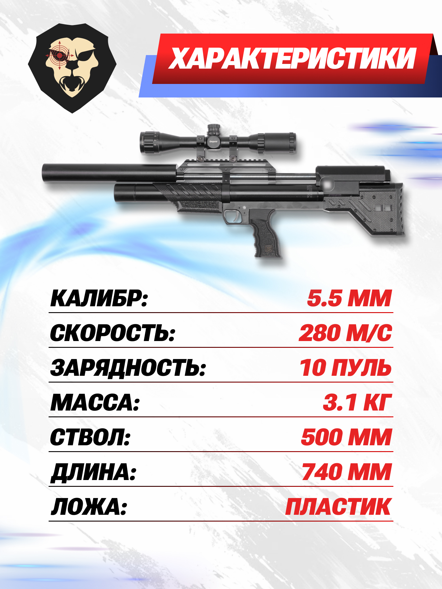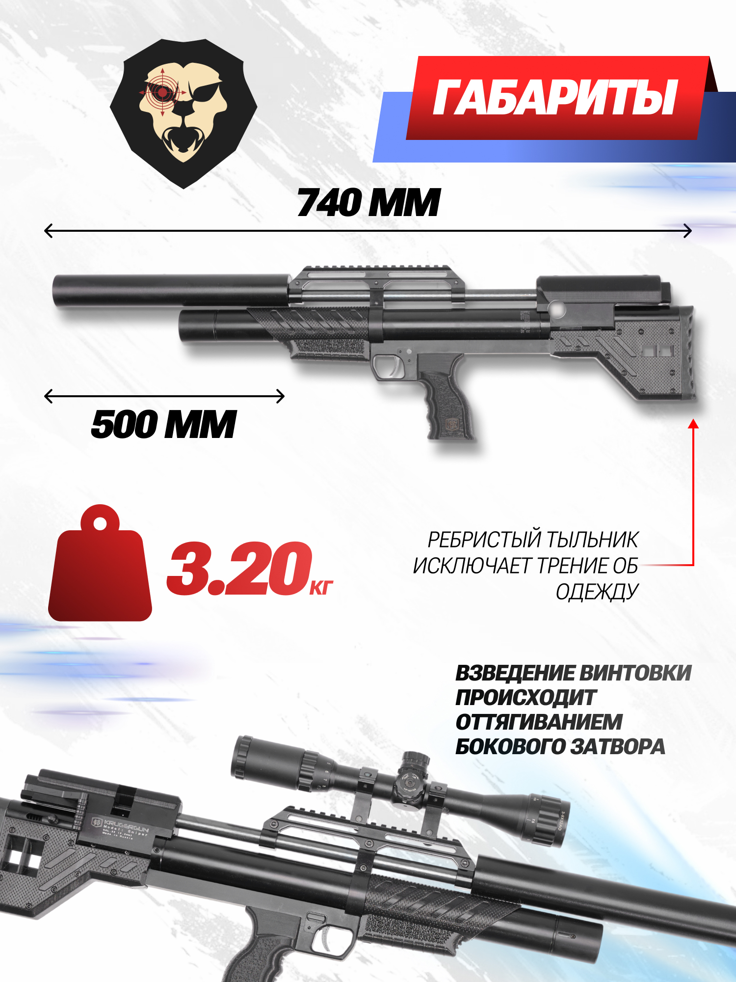 В этом исполнении оружие оснастили резервуаром длиной 420 мм - узел вмещает 226 кубических сантиметров воздуха. Уточняется, что винтовка работает в прямоточном режиме.