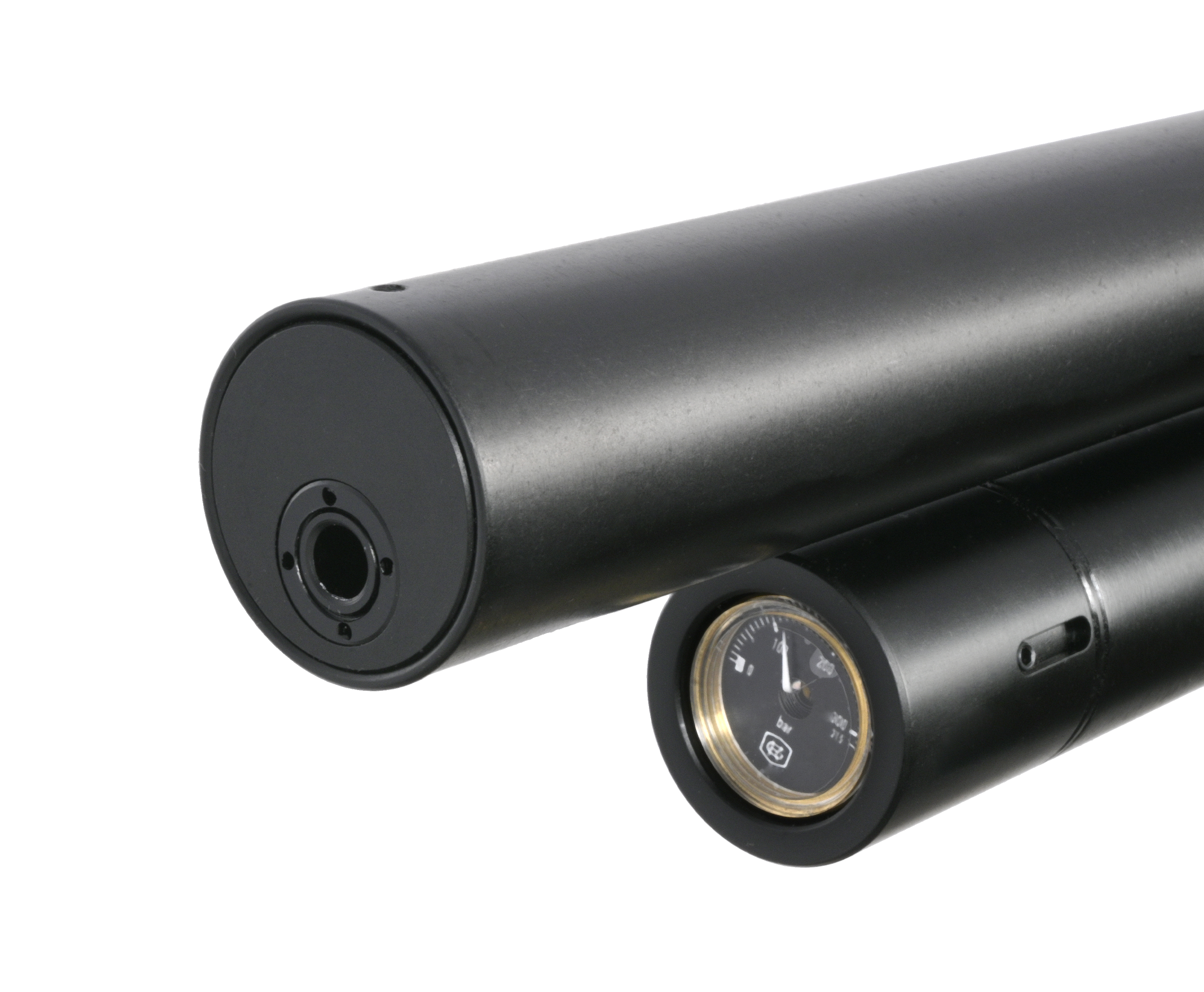 KrugerGun Снайпер Буллпап 5.5 мм выпускается оснащенная баллоном на 290 куб. сантиметров воздуха. Цилиндрический баллон длиной 510 миллиметров устанавливается изготовителем под стволом оружия. Баллон оснащается гнездом для подключения насоса, а также манометром для отслеживания давления, нагнетающегося внутри.