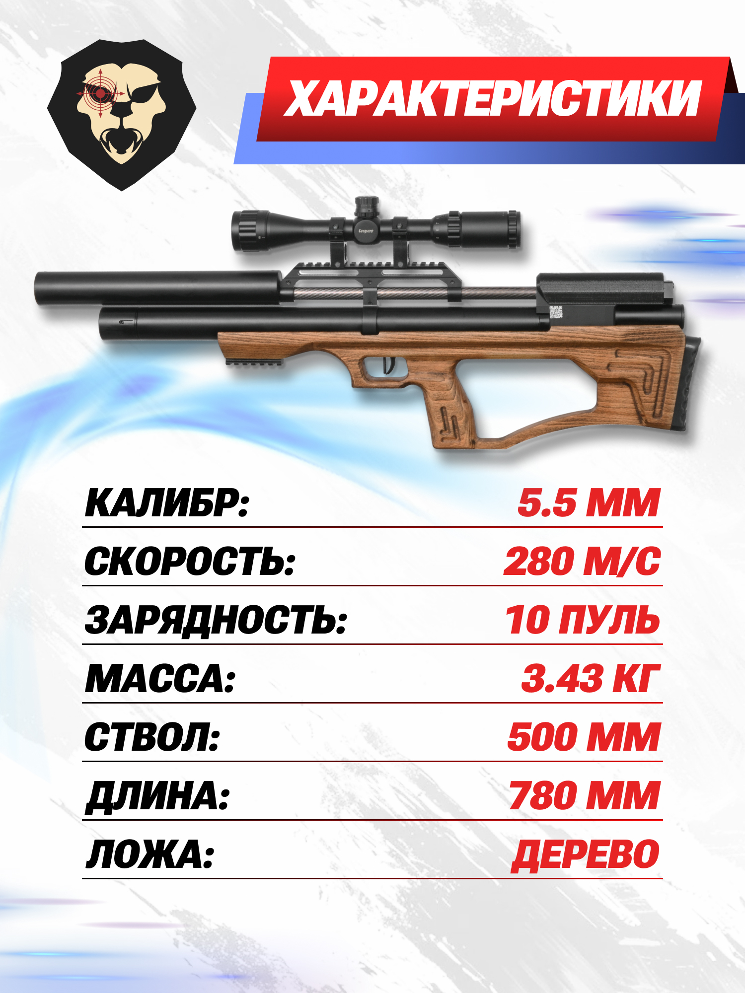 Информация о товаре "Пневматическая винтовка Krugergun Снайпер 5.5 мм Буллпап (500 мм, редуктор, дерево L, резервуар 510)" носит ознакомительный характер, и не является публичной офертой, определяемой положениями Статьи 437 Гражданского кодекса Российской Федерации, характеристики, внешний вид, цвет и комплектация могут быть изменены производителем без уведомления.