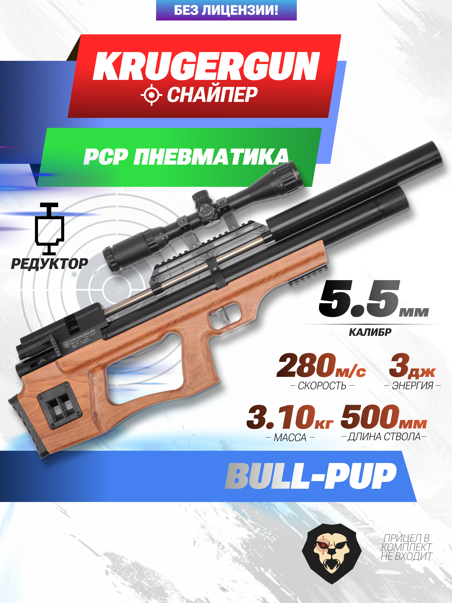 Информация о товаре "Пневматическая винтовка Krugergun Снайпер 5.5 мм Буллпап (500 мм, редуктор, дерево, резервуар 510)" носит ознакомительный характер, и не является публичной офертой, определяемой положениями Статьи 437 Гражданского кодекса Российской Федерации, характеристики, внешний вид, цвет и комплектация могут быть изменены производителем без уведомления.