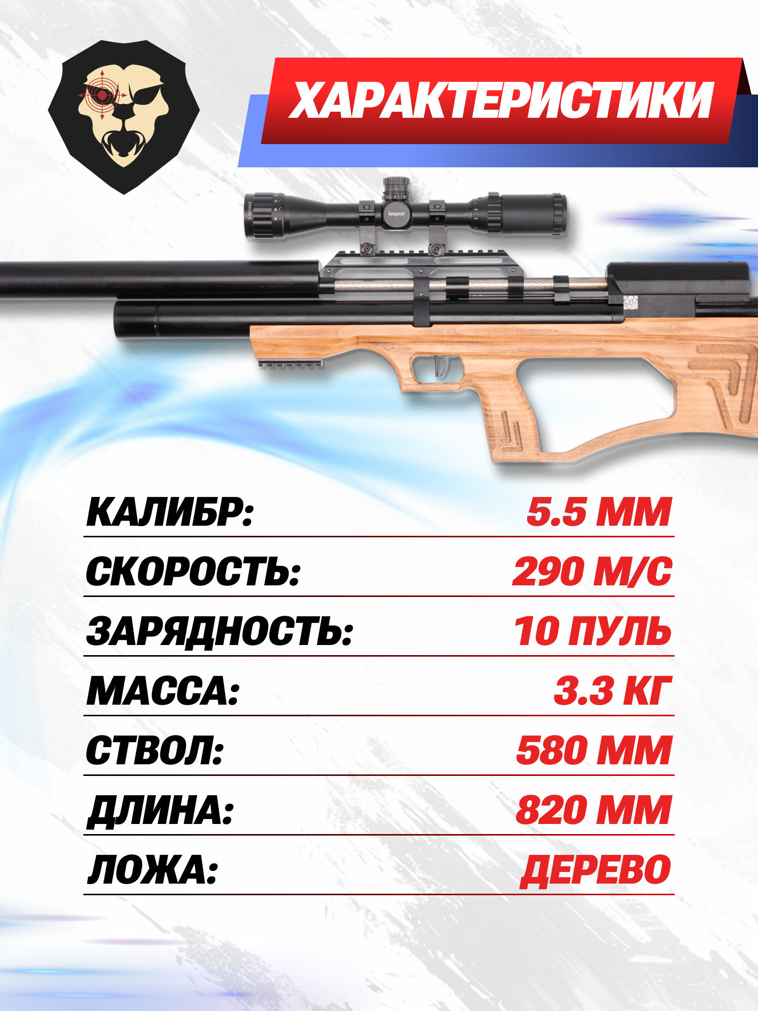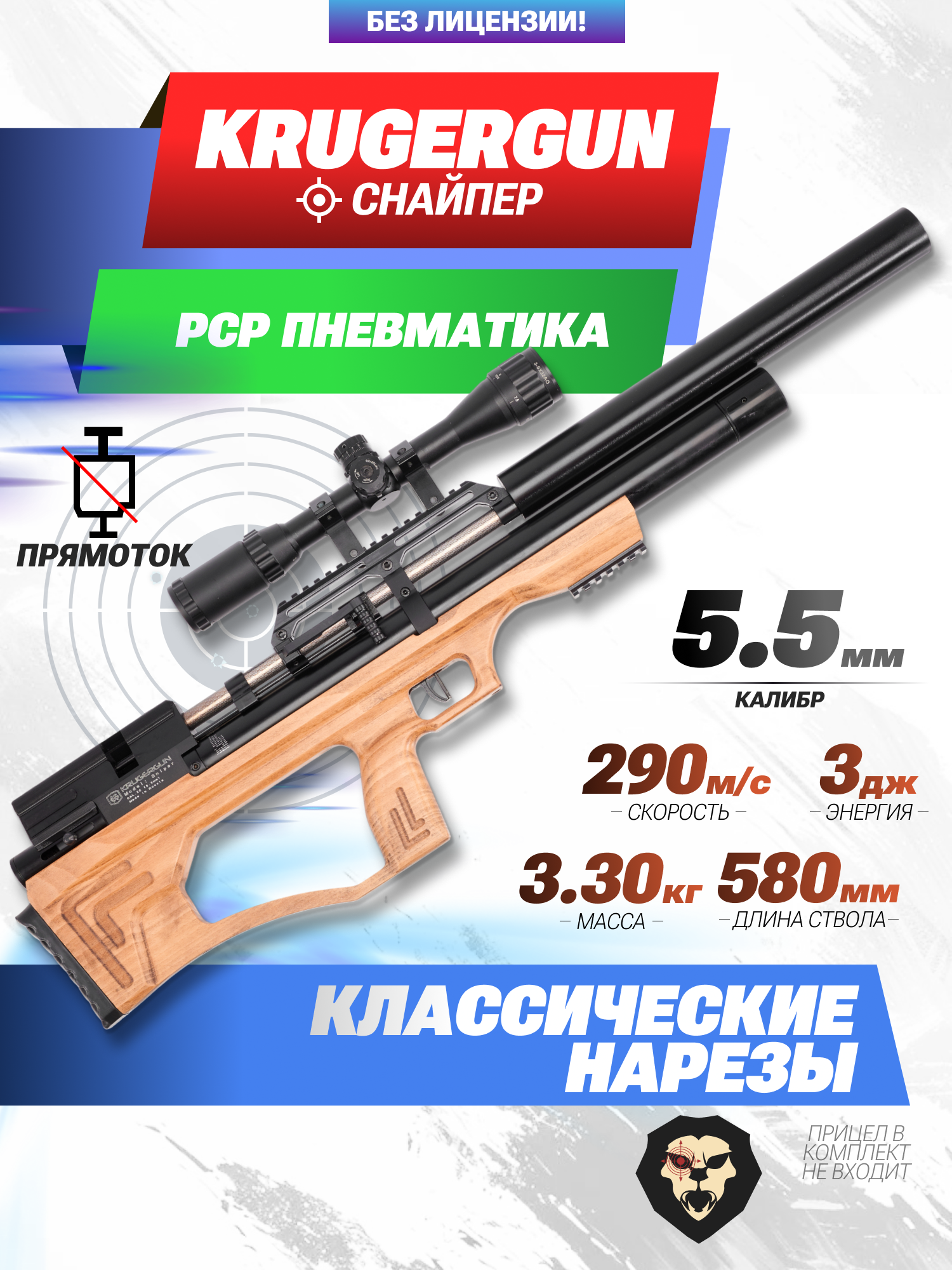 Информация о товаре "Пневматическая винтовка Krugergun Снайпер 5.5 мм Буллпап (580 мм, прямоток, передний взвод, дерево L, резервуар 510) " носит ознакомительный характер, и не является публичной офертой, определяемой положениями Статьи 437 Гражданского кодекса Российской Федерации, характеристики, внешний вид, цвет и комплектация могут быть изменены производителем без уведомления.