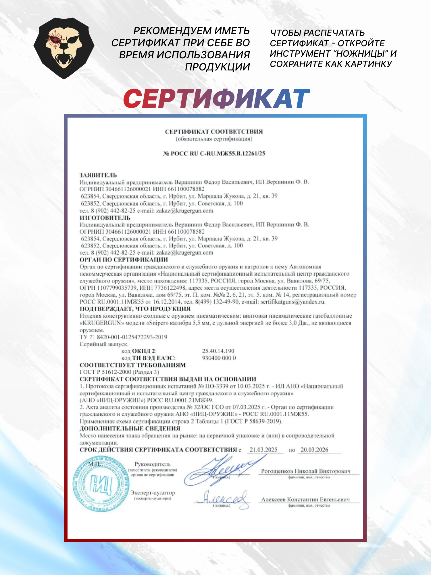 | Комплектация | Винтовка, упаковка, заправочный штуцер, краткая документация, магазин, РТИ, копия сертификата (по запросу покупателя) |