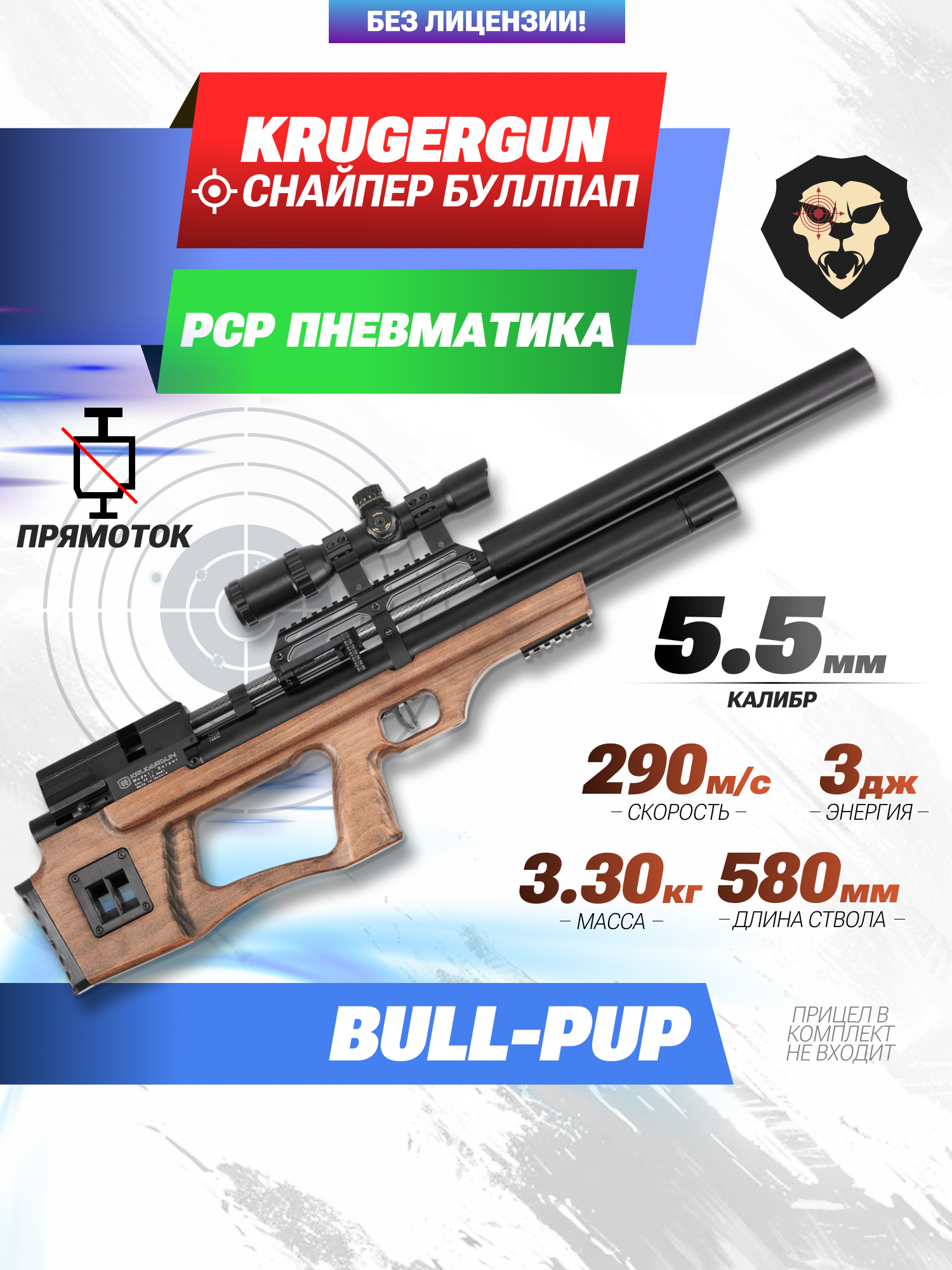 Информация о товаре "Пневматическая винтовка Krugergun Снайпер 5.5 мм Буллпап (580 мм, прямоток, передний взвод, дерево, резервуар 510) " носит ознакомительный характер, и не является публичной офертой, определяемой положениями Статьи 437 Гражданского кодекса Российской Федерации, характеристики, внешний вид, цвет и комплектация могут быть изменены производителем без уведомления.